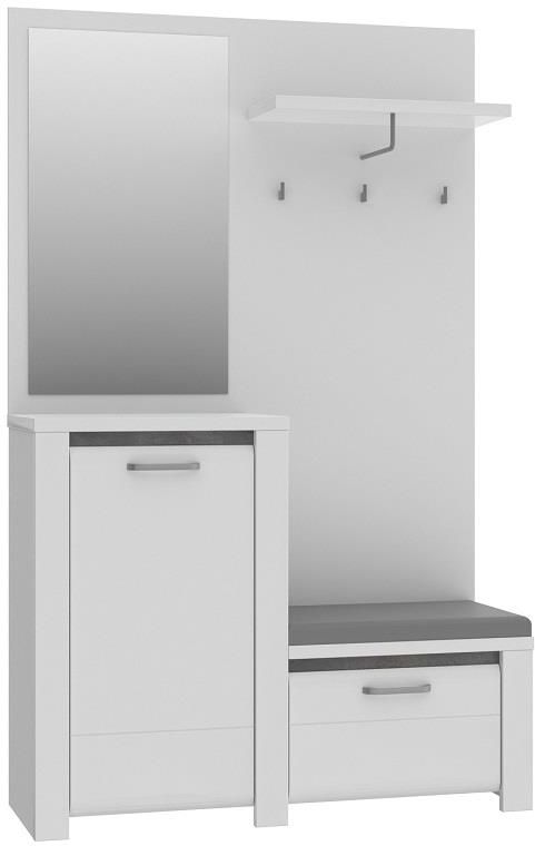 Przedpokój Szafka na Buty Wieszak Lustro Biały Połysk Brugia BUGD01-C670 Ogólnie Meble do przedpokoju z kolekcji BRUGIA pozwolą na estetyczne zagospodarowanie niewielkiej przestrzeni. Uniwersalny biały kolor z akcentem betonowej wstawki nada pomieszczeniu ciekawego akcentu oraz optycznie je …