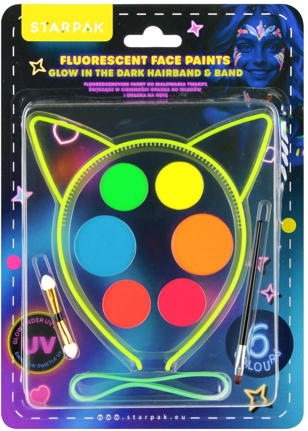 Starpak Farby do Malowania Twarzy 6 kolorów Fluo 546490 Farby do malowania twarzy, ciała, 6 kolorów fluorescencyjne z akcesoriami w postaci opaski. Farby w 6 kolorach: zielony, żółty, niebieski, pomarańczowy, dwa odcienie czerwonego, farby są łatwo zmywalne, bezpieczne (przed użyciem zapoznaj się z opisem produktu znajdującym się na opakowaniu!). Dzięki temu zestawowi kreatywność dziecka nie zna granic! Każda farbka zapakowana w osobnym pojemniczku, mały podwójny aplikator do malowania oraz mały pędzelek z pewnością spełnią oczekiwania. Zawartość zestawu: 6 kolorów farb do malowania twarzy 1 x pędzelek 1 x aplikator do malowania opaska do włosów z uszami Wymiary opakowania ( wys. x szer. x gł.) [cm]: 19x27x3 Nieodpowiednie dla dzieci poniżej 3 roku życia