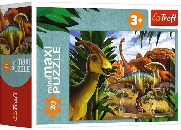 Trefl Puzzle miniMaxi 20el. Świat dinozaurów 21137 Puzzle 20 elementów MiniMaxi to rewelacyjny zestaw dla najmłodszych zaprojektowany z myślą o wszystkich fanach i fankach Dinozaurów.  Po ułożeniu układanki powstanie obrazek o wymiarach 220x160mm. Puzzle zapakowane w małe, wygodne pudełeczku, które swobodnie zmieści się w dziecięcym plecaczku i na półce z zabawkami.  Puzzle przyjazne dziecku – do produkcji użyto ekologicznych farb spożywczych i płótnowanego papieru eliminującego odbijanie światła, co gwarantuje bezpieczeństwo i radość zabawy. Układanie puzzli niesie za sobą szereg korzyści, zarówni dla dzieci jak i dorosłych. To skuteczny sposób na ćwiczenie pamięci, koncentracji, a także niezawodny sposób na odstrsowanie się i odprężenie. Dzięki puzzlom trenujemy spostrzegawczość, ale również uczymy się cierpliwości. Ułożony przez nas, gotowy obraz możemy powiesić na ścianie, a tym samym urozmaicić wnętrze naszego mieszkania.