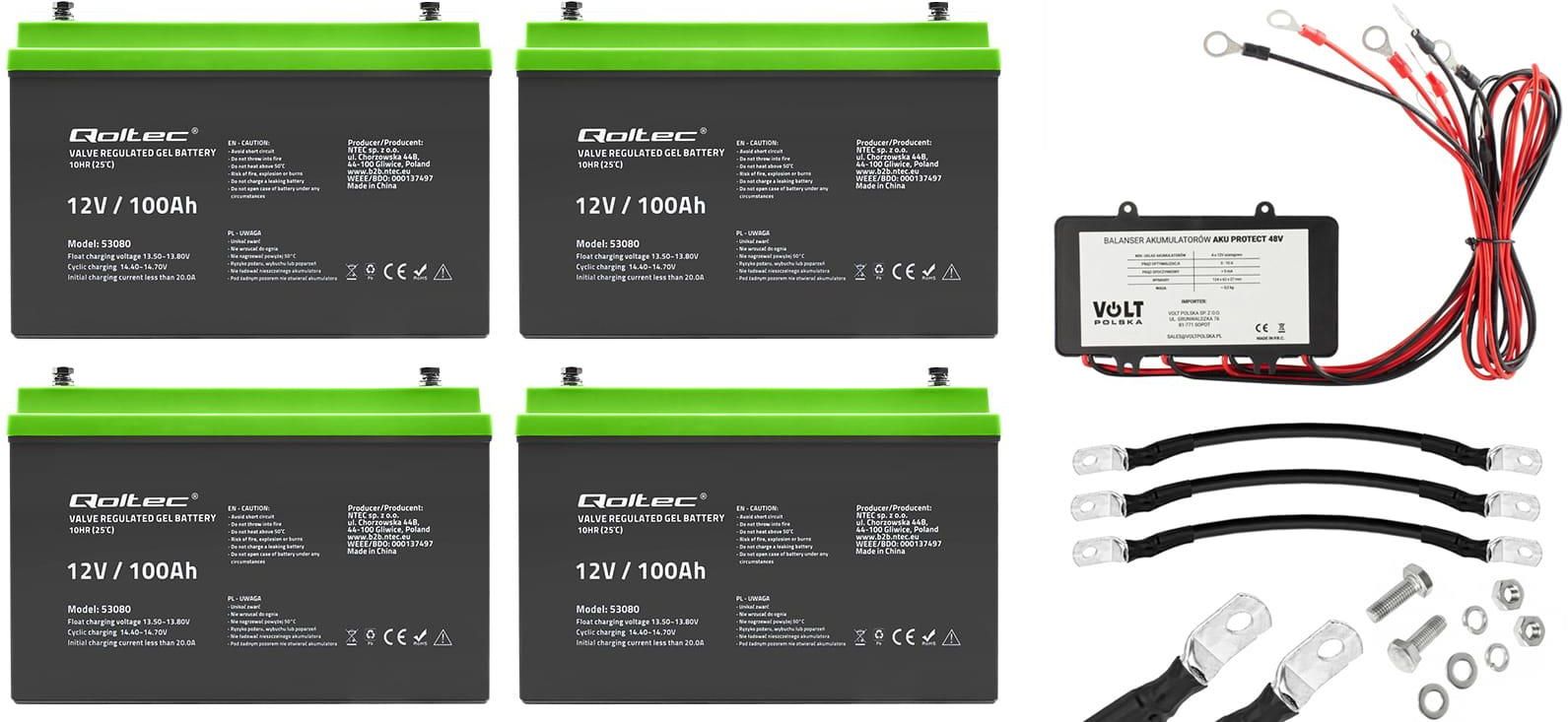 Zestaw: 4 x akumulator żelowy Qoltec GEL Professional LongLife 12V 100Ah + balanser 48V Pszów