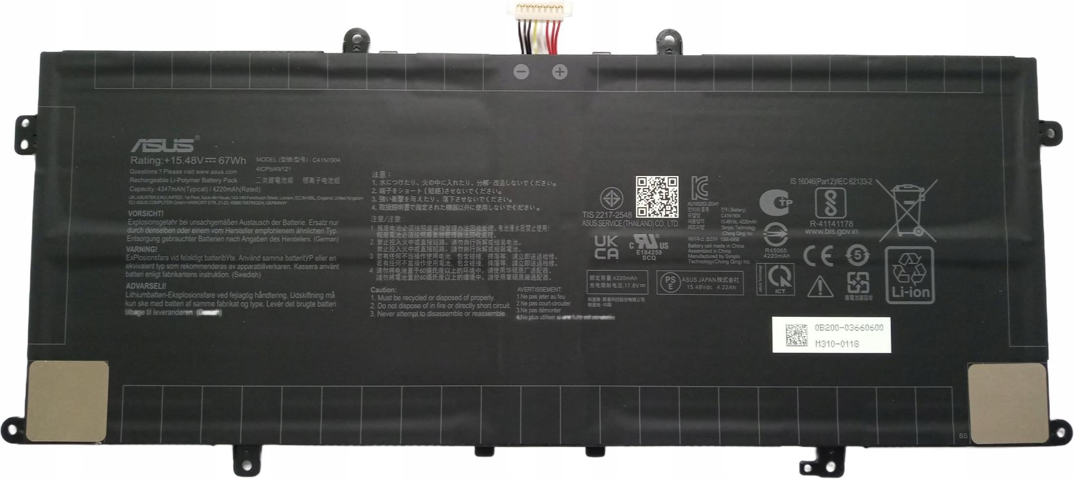 100% ORYGINALNA BATERIA Asus 67Wh 4220mAh 15,48V Bateria pochodzi z oficjalnego kanału dystrybucyjnego firmy Asus na Polskę Posiada kod QR z numerem seryjnym oraz wszystkie oznaczenia unikalne dla oryginalnych produktów Asus Najważniejsze cechy Ogniwa litowo-jonowe - markowe ogniwa zapewniają wysoką, realną pojemność 4220mAh Wysoka pojemność przekłada się na długi czas pracy baterii w zależności od konfiguracji laptopa i trybu pracy Ogniwa oryginalne to także trwałość - nawet do 1000 pełnych cykli ładowania Nowoczesna elektronika sterująca zapewnia pełną kompatybilność Parametry techniczne Producent: Asus Rodzaj ogniw: litowo-polimerowe Pojemność: 4220mAh (67wh) Napięcie: 15,48V Stan: fabrycznie nowa Zabezpieczenie przed przegrzaniem - TAK Zabezpieczenie przed głębokim rozładowaniem - TAK Zabezpieczenie przed przeładowaniem - TAK Bateria jest zgodna z innymi typami bateriami jak niżej Modele baterii: C41N1904 C41N1904-1 0B200-03660200 0B200-03660500 Bateria pasuje do podanych niżej modeli laptopów Modele laptopów ZENBOCK 13 UX325JA-AH024T ZenBook 13 UX325EA ZenBook 13 UX325EA-AH012T ZenBook 13 UX325EA-EG022T ZenBook 13 UX325JA ZenBook 13 UX325SA ZenBook 13 UX325UA ZenBook 14 UX425EA-HA109T ZenBook 14 UX425EA-HM093T ZenBook 14 UX425EA-HM115T ZenBook 14 UX425JA ZenBook 14 UX425JA-HM020T ZenBook 14 UX425JA-HM027R ZenBook 14 UX425JA-HM094T ZenBook 14 UX425UA ZenBook Flip 13 UX363EA ZenBook Flip 13 UX363EA-EM045R ZenBook Flip 13 UX363EA-HP258T ZenBook Flip 13 UX363JA-EM039T ZenBook Flip 13 UX363JA-HR195T ZenBook S13 UX393EA BX325J BX325JA BX325EA Zenbook 13 BX325 ZenBook S13 UX393EA-HK001R ZenBook S13 UX393EA-HK022T ZenBook S13 UX393JA ZENBOCK 13 UX325JA-AH024T ZenBook 13 UX325EA ZenBook 13 UX325EA-EG022T ZenBook 13 UX325EA-EG071R ZenBook 13 UX325EA-KG229R ZenBook 13 UX325EA-KG327T ZenBook 13 UX325JA ZenBook 13 UX325SA ZenBook 14 UX425EA-HM115T ZenBook 14 UX425JA ZenBook 14 UX425JA-BM226R ZenBook 14 UX425JA-HM008T ZenBook 14 UX425JA-HM020T ZenBook 14 UX425JA-HM027R ZenBook 14 UX425JA-HM299T ZenBook 14 UX425UA ZenBook Flip 13 UX363EA ZenBook Flip 13 UX363EA-EM047T ZenBook Flip 13 UX363EA-HP069T ZenBook Flip 13 UX363EA-HP258T ZenBook Flip 13 UX363JA-EM039T ZenBook Flip 13 UX363JA-HR195R ZenBook Flip 13 UX363JA-HR195T ZenBook S13 UX393JA Przed kliknięciem "KUP TERAZ" Sprawdź czy model Twojego laptopa (lub baterii) jest na liście jak powyżej Porównaj wygląd baterii z laptopa ze zdjęciem w aukcji (baterie czasem są bardzo podobne ale nie pasują) Po kliknięciu "KUP TERAZ" Koniecznie w sekcji *Uwagi do zakupu* wpisz numer seryjny laptopa Znajduje się on na etykiecie od spodu laptopa oraz w BIOS (Esc) Jeżeli nie możesz odczytać numeru seryjnego to wpisz pełny model laptopa Pozwoli nam to przed wysyłką sprawdzić czy bateria jest odpowiednia do wskazanego komputera PAMIĘTAJ Kto szybko kupuje, ten dwa razy kupuje. Modele pasujących laptopów Asus 0B200-03660200 0B200-03660500 C41N1904 C41N1904-1 ZENBOCK 13 UX325JA-AH024T ZenBook 13 UX325EA ZenBook 13 UX325EA-AH012T ZenBook 13 UX325EA-EG022T ZenBook 13 UX325EA-EG071R ZenBook 13 UX325EA-KG229R ZenBook 13 UX325EA-KG327T ZenBook 14 UM425IA ZenBook UM425IA UX325EA-KG239T ZenBook 14 UM425I Zenbook Flip 13 UX363JA-EM120T UX363JA-EM120T ZenBook UM425I ZenBook 13 UX325JA ZenBook 13 UX325SA ZenBook BX425JA-BM294R BX425JA-BM143R BX425JA-BM294R ZenBook BX425JA-BM277R BX425JA-BM275R ZenBook 13 UX325UA ZenBook 14 UX425EA-HA109T ZenBook 14 UX425EA-HM093T ZenBook 14 UX425EA-HM115T ZenBook 14 UX425JA ZenBook 14 UX425JA-BM226R ZenBook 14 UX425JA-HM008T ZenBook 14 UX425JA-HM020T ZenBook 14 UX425JA-HM027R ZenBook 14 UX425JA-HM094T ZenBook 14 UX425JA-HM299T ZenBook 14 UX425UA ZenBook Flip 13 UX363EA ZenBook Flip 13 UX363EA-EM045R ZenBook Flip 13 UX363EA-EM047T ZenBook Flip 13 UX363EA-HP069T ZenBook Flip 13 UX363EA-HP258T ZenBook Flip 13 UX363JA-EM039T ZenBook Flip 13 UX363JA-HR195R ZenBook Flip 13 UX363JA-HR195T ZenBook S13 UX393EA ZenBook S13 UX393EA-HK001R ZenBook S13 UX393EA-HK022T ZenBook S13 UX393JA