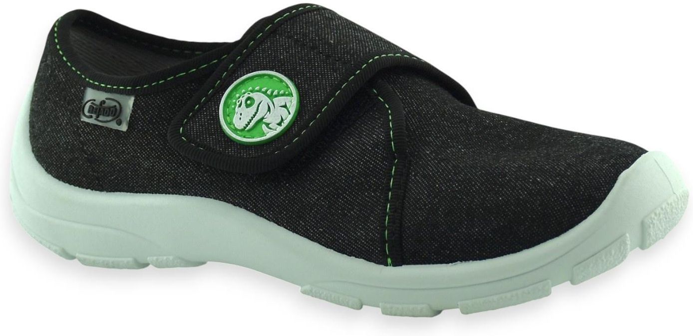 Czarne kapcie chłopięce z elastyczną i oddychającą podeszwą doskonale sprawdzą się zarówno w domu, jak i w szkole. Szeroki przód gwarantuje komfort i swobodę a zapięcie na rzep sprawia, że zakładanie jest szybkie i proste.