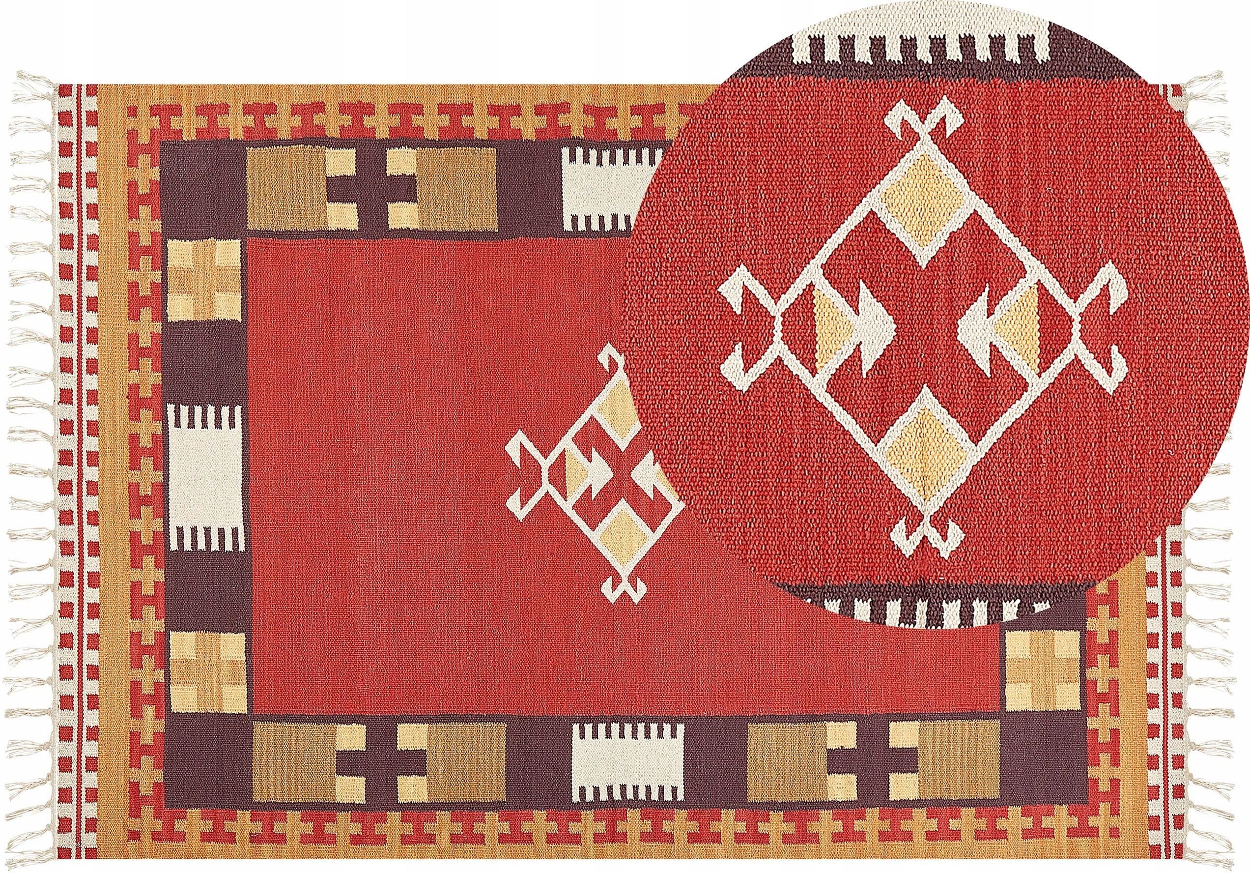 Beliani jest pochodzącym ze Szwajcarii producentem mebli obecnym w 17 krajach oraz jednym z naszybciej rozwijających się sklepów internetowych w Polsce. W naszej ofercie znajdują się produkty zarówno do salonu, sypialni, ogrodu, biura, łazienki, jak i akcesoria oraz oświetlenie. Już od 10 lat nasi klienci mogą korzystać z darmowej dostawy i zwrotów oraz cieszyć się designerskimi meblami w atrakcyjnych cenach - od teraz dostępnymi również w bezpiecznej sprzedaży za pośrednictwem Allegro. Dywan bawełniany kilim 160 x 230 cm wielokolorowy PARAKAR Poczuj orientalny klimat w swoim wnętrzu z tym wyjątkowym dywanem typu kilim. Stworzony z artyzmem i miłością, jego skomplikowane wzory w hipnotyzujących odcieniach czerwieni i brązu stanowią niepowtarzalną dekorację. Urocze frędzle po na obu końcach dywanu dodają odrobinę charakteru boho do całej przestrzeni. A kiedy zdarzy się mały wypadek, spokojnie odpocznij, wiedząc, że ten dywan można prać w pralce, co zapewnia łatwe utrzymanie i trwały urok. Oferta zawiera: 1 x Dywan Stan: Nowy Szczegóły: Kolor: Kolorowy, Czerwony, Brązowy, Beżowy Materiał: Bawełna Skład materiału: 100% Bawełna Waga: 4 kg Montaż: Nie wymaga montażu Dodatkowe informacje: Szerokość: 160 cm Długość: 230 cm Długość włosia: 0.5 cm Z uwagi na materiał, z którego produkt jest wykonany, może on sporadycznie gubić włosie. Jest to normalny proces i nie stanowi wady produktu., Ze względu na tkanie ręczne każdy dywan może nieznacznie odbiegać od prezentowanego na zdjęciu kolorem, wzorem lub rozmiarem (+/- 5-7 cm). Różnice te nie stanowią jednak wady produktu., Produkt po rozpakowaniu potrzebuje czasu, aby osiągnąć swój docelowy stan - wyprostowanie może zająć do 72 godzin. Polecamy użycie przedmiotów o dużej wadze na brzegach dywanu dla lepszego efektu. Cechy produktu Ręczne wykonanie z najwyższą prezycją Dwustronny wzór Idealne zarówno do sypialni jak i salonu Dodaje domowego charakteru Wysoka jakość wykonania Nadaje się do prania w pralce Wskazówki dotyczące pielęgnacji: Wskazówki dotyczące pielęgnacji: Bawełna: 1.Nie suszyć w suszarce i nie prasować, chyba że metka wskazuje inaczej 2.Prać ręcznie lub w pralce, wybierając program do prania tkanin delikatnych (maks. 30°C), o ile producent nie zaleca inaczej. 401206