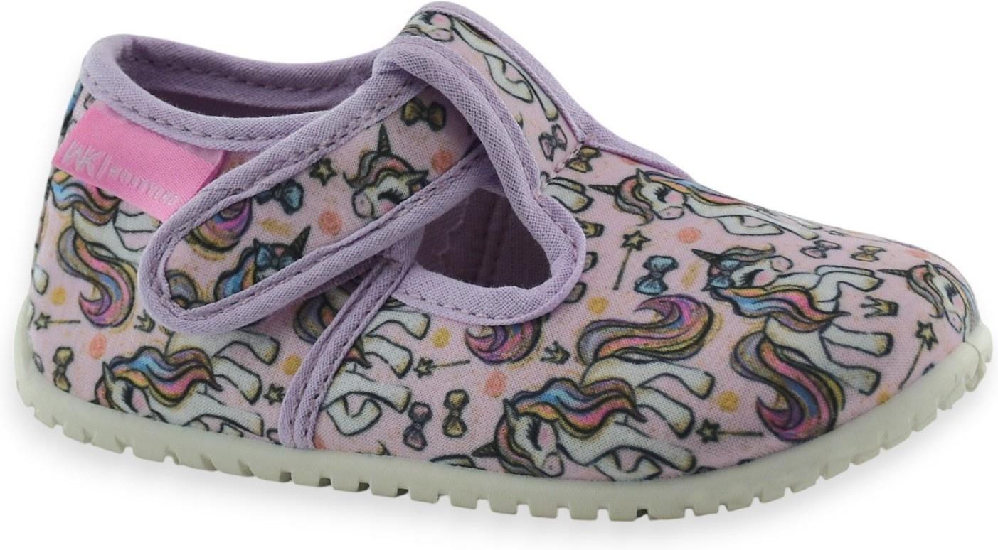 Kapcie dziewczęce typu barefoot z urokliwym motywem jednorożców z pewnością przypadną do gustu małym miłośniczkom bajkowych wzorów. Praktyczne zapięcie na rzep ułatwia szybkie i wygodne zakładanie. Obuwie doskonałe do domu, żłobka czy przedszkola.