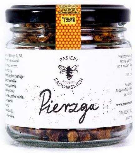 Pierzga pszczela to naturalny produkt, który powstaje dzięki pszczołom. Podczas zbiorów pyłku kwiatowego pszczoły mieszają go z niewielką ilością miodu i śliny. Do ula przynoszą mieszankę w postaci niewielkich grudek, które w ulu umieszczane są w komórkach plastra. Po tym zaczyna się proces fermentacji przy udziale kwasu mlekowego, można to porównać do kiszenia kapusty. Według specjalistycznych badań naukowych pierzga jest łatwo przyswajalną, multiwitaminą będąca cennym źródłem białka, witamin, składników mineralnych, aminokwasów, tłuszczów i węglowodanów. Pierzga pszczela należy do trudno dostępnych produktów pszczelarskich, ponieważ służy także jako pokarm dla pszczół. Pierzgę można kupić w postaci tabletek, kapsułek, a także u zaufanych pszczelarzy. Pierzga, a pyłek kwiatowy Pierzga jest lepiej przyswajalna przez organizm. Zawiera także więcej węglowodanów, wolnych aminokwasów, kwasu mlekowego oraz mikroelementów, ale mniej białka, substancji lipidowych oraz nienasyconych kwasów tłuszczowych. Czy pierzga jest zdrowa? Pierzga to szereg właściwości zdrowotnych. Regularne spożywanie pierzgi może poprawić pracę metabolizmu i wzmocnić organizm. Badania wykazały, że w składzie pierzgi znajdują się: witaminy: A, B1, B2, B6, B12, C, D, E, K, P i PP oraz pierwiastki: potas, żelazo, selen, magnez, miedź, krzem, chlor, siarkę, mangan, a także enzymy. Jak stosować pierzgę? Pierzgę można żuć samodzielnie, można użyć jej jako posypki do dań, sałatek, deserów. Można ją także rozpuścić w letniej wodzie i popijać, a także dodać do miodu. Dzienna dawka pierzgi dla osoby dorosłej to od 10 g do 20 g. Dla dzieci od 5 g do 10 g. Należy pamiętać, że pierzga może powodować reakcję alergiczną u osób uczulonych na pyłki kwiatów. Najlepiej na początek spróbować kilku granulek i obserwować, czy nie występują objawy reakcji alergicznej (np. swędzenie uszu lub gardła). Składniki 100% pierzga pszczela Informacje dodatkowe Przechowywać w chłodnym miejscu. Masa netto 100 g Pasieki Sadowskich to rodzinna firma pszczelarska, która powstała z miłości do pszczół oraz ich produktów. Grupa osób pasjonująca się pszczołami wkłada swoje całe serce, aby owadom mogło żyć się o wiele lepiej. W zamian Pasieki Sadowskich otrzymują przepyszne miody i wyroby pszczelarskie, którymi dzielą się ze swoimi klientami. Pasieki Sadowskich charakteryzują się wyjątkowymi połączeniami przepysznych i zdrowych miodów z naturalnymi dodatkami, które nadają im wyjątkowy smak, kolor i aromat.