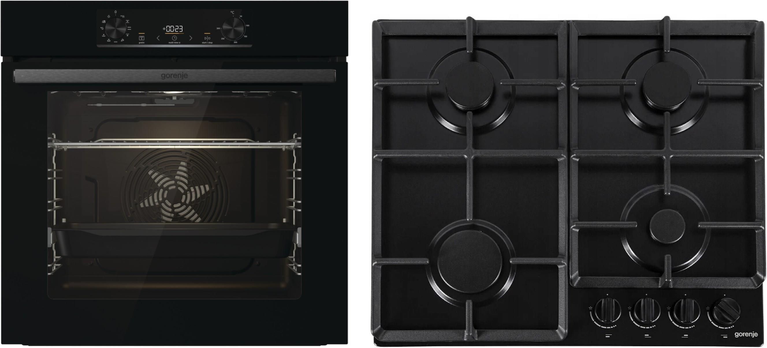 Zestaw do zabudowy Gorenje piekarnik BO6735E02BK w kolorze czarnym i płyta gazowa GT641EB w kolorze czarnym. Piekarnik o pojemności 77 litrów, ze sterowaniem elektronicznym,10 funkcjami i czyszczeniem aqua clean. Płyta gazowa czarna 60cm, z 4 palnikami gazowymi, i zabezpieczeniem przeciw wypływowym gazu.
