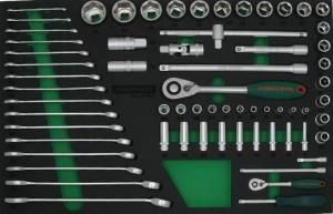 Zestaw narzędzi we wkładce EVA 65el JonneswayS04H2 11szt. - nasadki 1/4": 4, 5, 5.5, 6, 7, 8, 9, 10, 11, 12, 13mm S04HD2 9szt. - nasadki 1/4" długie: 5, 6, 7, 8, 9, 10, 11, 12, 13mm R3702 1szt. - grzechotka 1/4" 48z. S24H2 2szt. - przedłużki 1/4": L=50mm, L=150mm S26H2150 1szt. - pokrętło wkrętakowe 1/4" S04H4 18szt. - nasadki 1/2": 10, 11, 12, 13, 14, 15, 16, 17, 18, 19, 20, 21, 22, 23, 24, 27, 30, 32mm S17H4 2szt. - nasadki do świec: 16mm, 21mm S24H4 2szt. - przedłużki 1/2": L-125mm, L-250mm R3704 1szt. - grzechotka 1/2" 48z. S23H41250 1szt. - pokrętło z przetyczką 1/2" L-250mm S15H472 1szt. - przegub 1/2" W26 16szt. - klucze płasko-oczkowe: 6, 7, 8, 9, 10, 11, 12, 13, 14, 15, 16, 17, 18, 19, 22, 24mm