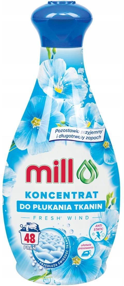 Koncentrat do płukania tkanin FRESH WIND 1,3l - MILL Koncentrat do płukania tkanin o przyjemnym zapachu świeżości. Nadaje tkaninom miękkość, ułatwia prasowanie i zapobiega elektryzowaniu się tkanin. Produkt przebadany dermatologicznie. STOSOWANIE W PRALKACH AUTOMATYCZNYCH: Standardowy wsad pralki …