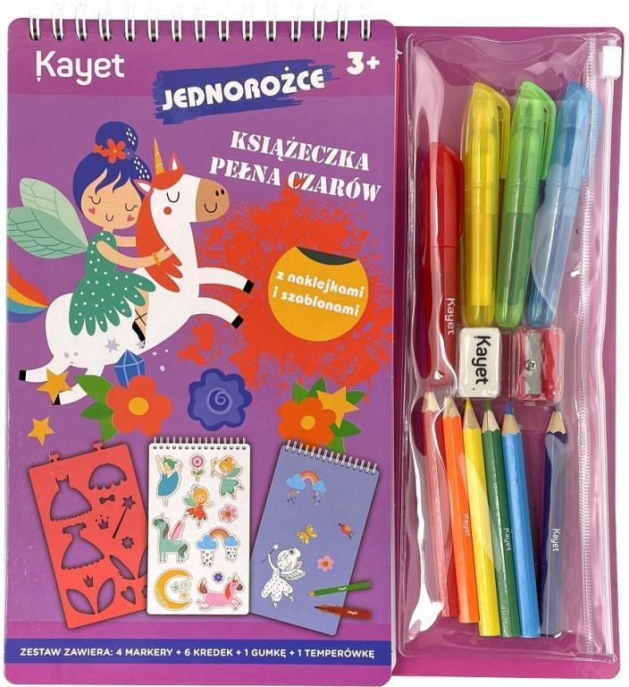 Książeczka Kreatywna JEDNOROŻCE to idealny sposób na przyjemną, ale i pożyteczną zabawę dla Twojego dziecka. Zabawa sensoryczna ma za zadanie stymulować rozwój fizyczny i umysłowy malucha. - 3 arkusze z szablonami, - 36 arkuszy do rysowania, - 4 pisaki akwarelowe, - 6 kolorowych kredek, - temperówka, - gumka do mazania,