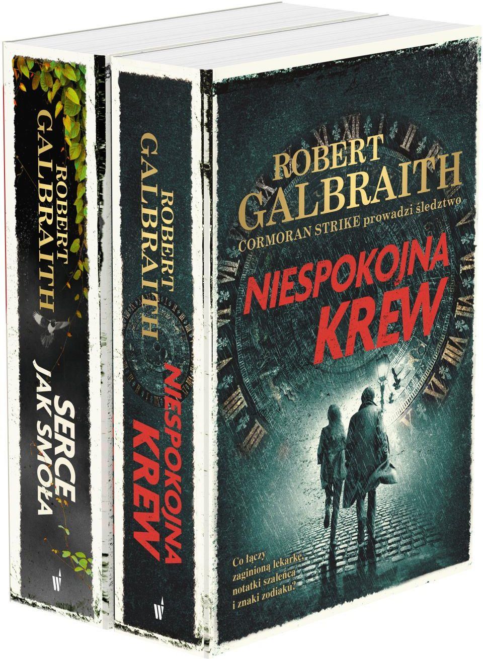 W pakiecie: - "Niespokojna krew" Gdy prywatny detektyw Cormoran Strike odwiedza w Kornwalii ciężko chorą ciotkę, kontaktuje się z nim kobieta, której matka w 1974 roku zaginęła w niewyjaśnionych okolicznościach. Strike jest zaintrygowany – nigdy nie pracował nad sprawą sprzed kilkudziesięciu lat. Mimo nikłych szans na powodzenie dopisuje zlecenie do długiej listy dochodzeń, które prowadzi ze swoją wspólniczką Robin Ellacott. Tymczasem Robin boryka się z trudnościami w życiu prywatnym. Na dodatek zarówno ona, jak i Strike zmagają się z uczuciami, których doświadczają w łączącej ich relacji. Badając okoliczności zaginięcia kobiety, para detektywów staje w obliczu piekielnie skomplikowanych tropów, wśród których są psychopatyczny morderca, nie zawsze godni zaufania świadkowie, a także karty tarota. Okazuje się, że nawet sprawy sprzed dekad mogą stanowić śmiertelne zagrożenie. - "Serce jak smoła" W agencji detektywistycznej Cormorana Strike’a i Robin Ellacott zjawia się roztrzęsiona młoda kobieta i błaga o rozmowę. To Edie Ledwell, współtwórczyni popularnej kreskówki Serce jak smoła. Od lat prześladuje ją w Internecie osoba posługująca się nickiem Anomia. Zdesperowana Edie prosi o ustalenie jej prawdziwej tożsamości, jednak Robin z kilku powodów odmawia przyjęcia sprawy. Jakiś czas później na cmentarzu Highgate, gdzie rozgrywa się akcja kreskówki, zostaje popełniona wstrząsająca zbrodnia. Poruszeni nią Robin i Cormoran przyjmują zlecenie schwytania mordercy. Para detektywów musi zmierzyć się z wirtualną rzeczywistością i wniknąć w skomplikowaną sieć nicków, sprzecznych interesów i nabrzmiałych konfliktów. Jednocześnie zarówno Robin, jak i Cormoran nieudolnie próbują poukładać swoje życie osobiste. Producent/osoba odpowiedzialna za bezpieczeństwo produktuPublicat S.A.ul. Chlebowa 2461-003 Poznańpublicat@publicat.pl616529252