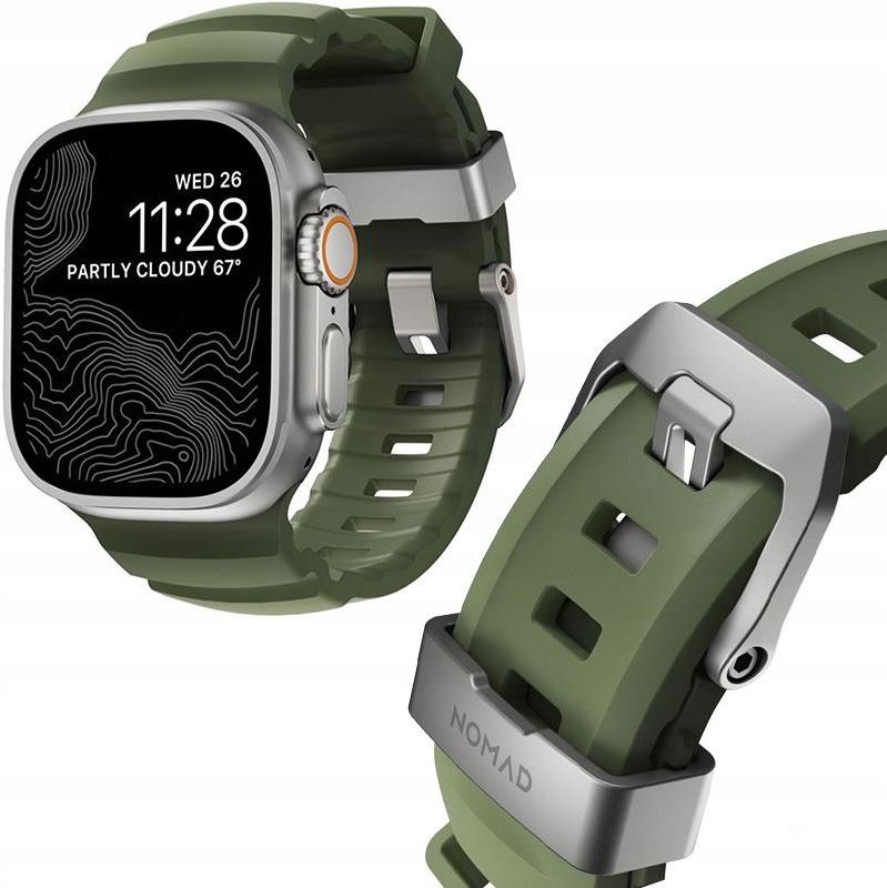 Nomad Rocky Point Band Do Apple Watch 10 (46 mm) Do Apple Watch Ultra 2 / 1 (49 mm) Apple Watch 9 / 8 / 7 (45 mm) Apple Watch SE 2022 / SE / 6 / 5 / 4 (44 mm) Apple Watch 3 / 2 / 1 (42 mm) Wersja kolorystyczna: Black / Storm (ciemnozielona ze srebrnymi elementami) Materiał: guma FKM Wodoodporny Odporność na pot, wodę Wewnętrzne kanały wentylacyjne Mocny, wytrzymały i lekki Stylowy i klasyczny design Doskonały dla aktywnych, jak i na wieczorne wyjście Kod producenta: NM014841858 Kod produktu: 856504014841 Przedmiotem sprzedaży jest sam pasek, pozostałe akcesoria widoczne na zdjęciach służą jedynie przedstawieniu jego funkcjonalności Długość i szerokość paska Zmierzyliśmy pasek, aby lepiej zobrazować jego rzeczywisty rozmiar. Zdjęcie jest poglądowe i pokazuje, jak produkt został zmierzony. X- długość paska: 20,88 cm Y- szerokość paska: 2,30 cm Sportowy styl! Szukasz idealnego akcesorium, które połączy styl z funkcjonalnością? Oto pasek Rocky Point Band od Nomad! Zaprojektowany został myślą o osobach aktywnych. Wykonany z wytrzymałej gumy FKM (kauczuku fluoroelastomerowego), znanej ze swojej elastyczności i odporności na różnorodne warunki atmosferyczne jest idealnym towarzyszem zarówno w trakcie intensywnych treningów, jak i codziennych wyjść. Deszcz, błoto? Wytrzyma! Jego wyjątkowa konstrukcja gwarantuje 100% wodoodporność oraz odporność na ekstremalne warunki. To oznacza, że bez względu na to, czy zmagasz się z deszczem, błotem czy intensywnym słońcem, pasek ten wytrzyma wszystko! Wytrzymały korpus nie tylko doskonale radzi sobie z dużymi naprężeniami, ale również zachowuje swój kształt i funkcjonalność nawet podczas najbardziej intensywnych aktywności. Bez ciężaru! Opaska jest lekka, jak piórko – niemal jej nie poczujesz na nadgarstku. Oddychające kanały zapewniają doskonałą wentylację, chroniąc przed potem i wilgocią, dzięki czemu będziesz czuł się świeżo i komfortowo przez cały dzień. Nie daj się ograniczać – wybierz opaskę, która będzie odzwierciedlać Twój styl życia!