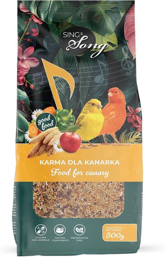 SKU: SSO0001 Producent: SING&SONG Karma dla kanarka Skład: nasiona mozgi kanaryjskiej 20%, proso 20%, rzepak 15%, owies bezłuskowy 10%, rzepik 10%, siemię lniane 5%, suszone jabłka 4%, konopie 3%, mak 3%, proso senegalskie 3%, suszona marchewka 2,5%, Murzynek 2,5%, papryka 0,5%, kwiat rumianku …