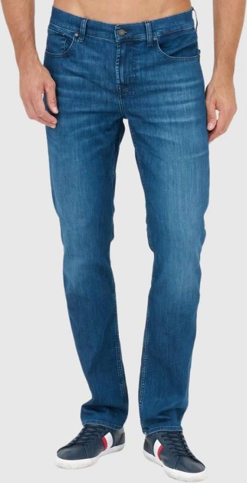 7 FOR ALL MANKIND - SLIMMY LUXE PERFORMANCE ECO INDIGO BLUE Elastyczne jeansy męskie w kolorze granatowym. Z przodu trzy, a z tyłu dwie wsuwane kieszenie. Zapinane na guzik i suwak. Proste nogawki. Delikatne pranie w pralce do 30°C, nie suszyć w suszarce bębnowej, nie stosować wybielaczy. ROZMIAR I …