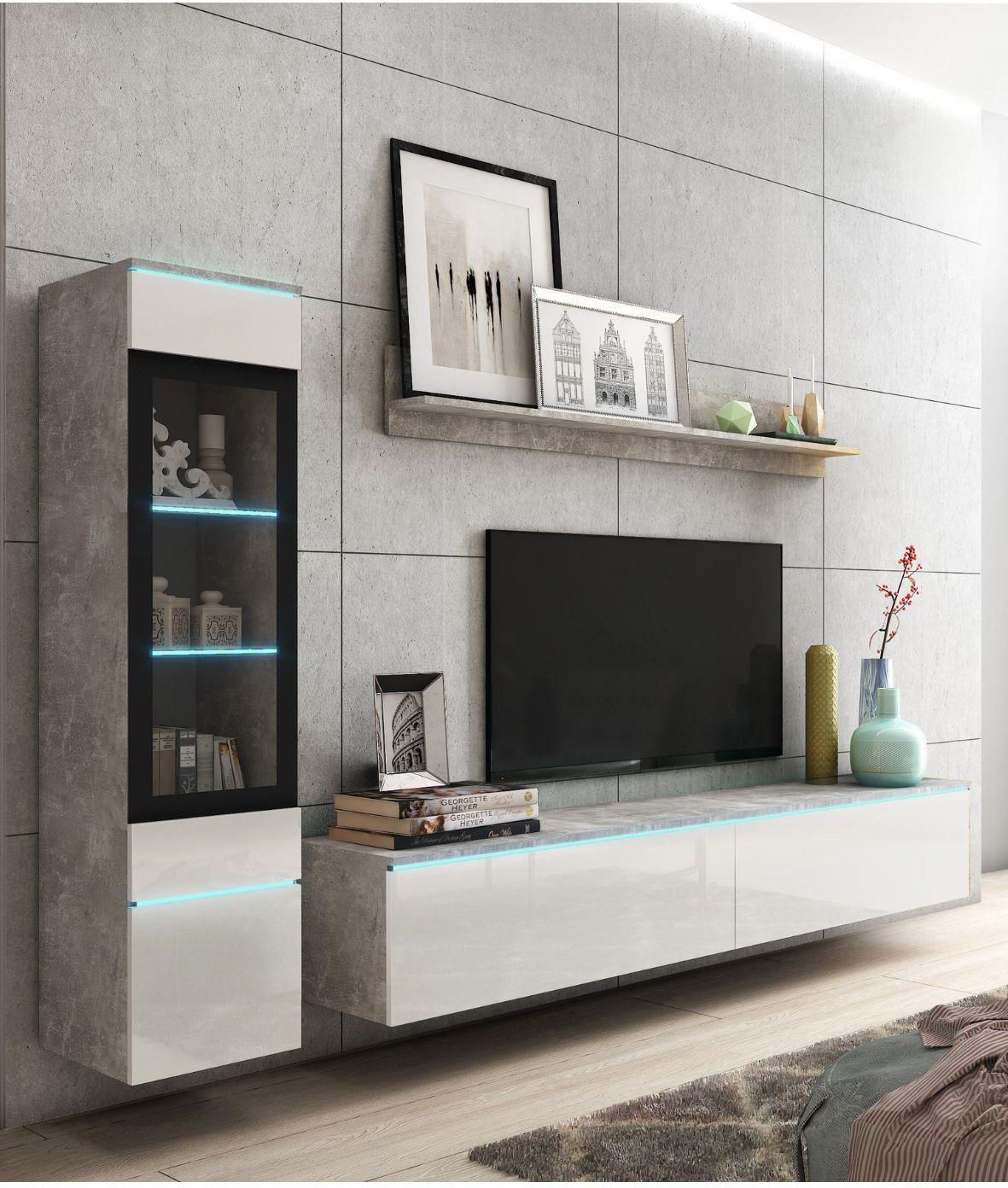 Komplet mebli RTV do salonu Vera I w kolorze biały połysk w połączeniu z betonowym wykończeniem, dedykowany jest dla osób, które cenią minimalistyczną formę i funkcjonalność w codziennym użytkowaniu.Komplet składa się z trzech elementów: pojemnej szafki RTV, stylowej witryny oraz praktycznej półki …