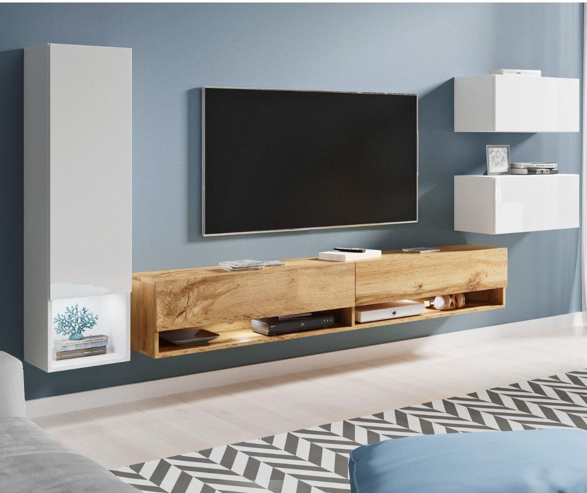 Meblościanka wisząca Amadeo to nowoczesne, eleganckie i funkcjonalne rozwiązanie do salonu, które łączy w sobie minimalistyczny design z praktycznym układem przestrzeni.Połączenie dębu wotan z białym połyskiem i z subtelnym oświetleniem LED (opcjonalnie) nadaje wnętrzu wyjątkowego charakteru i sprawia, że całość prezentuje sięciepło i nowocześnie.Korpus meblościanki wykonany jest z solidnej płyty laminowanej. Dąb wotan i biały połysk dodaje wnętrzu elegancji, przytulności i rozświetla przestrzeń.Gładkie powierzchnie bez widocznych uchwytów podkreślają nowoczesny, minimalistyczny charakter zestawu, a system otwierania z wystającymi frontami poza korpus zapewnia wygodne i bezgłośne użytkowanie.Zestaw składa się z kilku funkcjonalnych elementów, które razem tworzą harmonijną kompozycję na ścianie telewizyjnej. Wysoka szafka wyposażona jest w cztery przestronne półki, idealne do przechowywania książek, dokumentów czy dekoracji. Część dolna posiada otwartą wnękę z efektownym podświetleniem, które pozwala wyeksponować ozdobne elementy i nadaje wnętrzu przytulnego klimatu.Pod telewizorem umieszczona jest długa, wisząca szafka RTV o szerokości 180 cm i wysokości 30 cm, z dwiema dużymi komorami wyposażonymi w klapy otwierane do dołu. Dzięki temu idealnie sprawdza się jako miejsce na sprzęt multimedialny, dekodery, konsole czy kolekcję filmów. Otwory na przewody w tylnej ściance zapewniają estetyczne i dyskretne poprowadzenie kabli.Całość uzupełniają dwie mniejsze szafki wiszące o wymiarach 60 × 32,5 × 28,5 cm, które można zamontować dowolnie – symetrycznie lub asymetrycznie – dostosowując układ do własnych preferencji i przestrzeni w salonie.Wymiary:Model objęty jest 2 letnią gwarancją producenta.Produkt dostarczymy do Państwa BEZPŁATNIE pod wskazany adres na terenie całego kraju.Mebel wymaga samodzielnego montażu, zgodnie z załączoną instrukcją.Co WAŻNE: zgodnie z prawem i naszymregulaminemmają Państwo pełne prawo do zwrotu nieużywanych towarów, jeśli nie spełnią one Państwa oczekiwań.