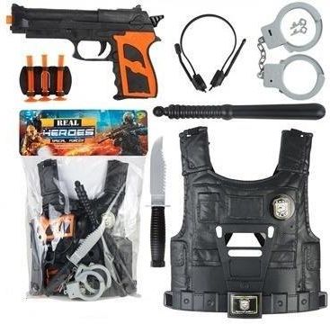 Wysokiej jakości zestaw wyposażenia sił specjalnych. Zawiera kamizelkę kuloodporną z pasem na naboje, broń na bezpieczne gumowe strzałki z przyssawką, kajdanki, pałke policyjną, sztylet oraz zestaw słuchawkowy.