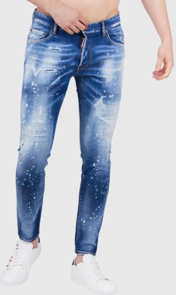 DSQUARED2 "SUPER TWINKY JEAN" Jeansy męskie zapinane na guziki w kolorze niebieskim. Ozdobione przetarciami, plamami oraz łatami. Z przodu trzy, z tyłu dwie wsuwane kieszenie. Z przodu przy zapięciu czerwona metka z logo. Z tyłu żółta metka. Delikatne pranie w pralce do 30°C, nie suszyć w suszarce …
