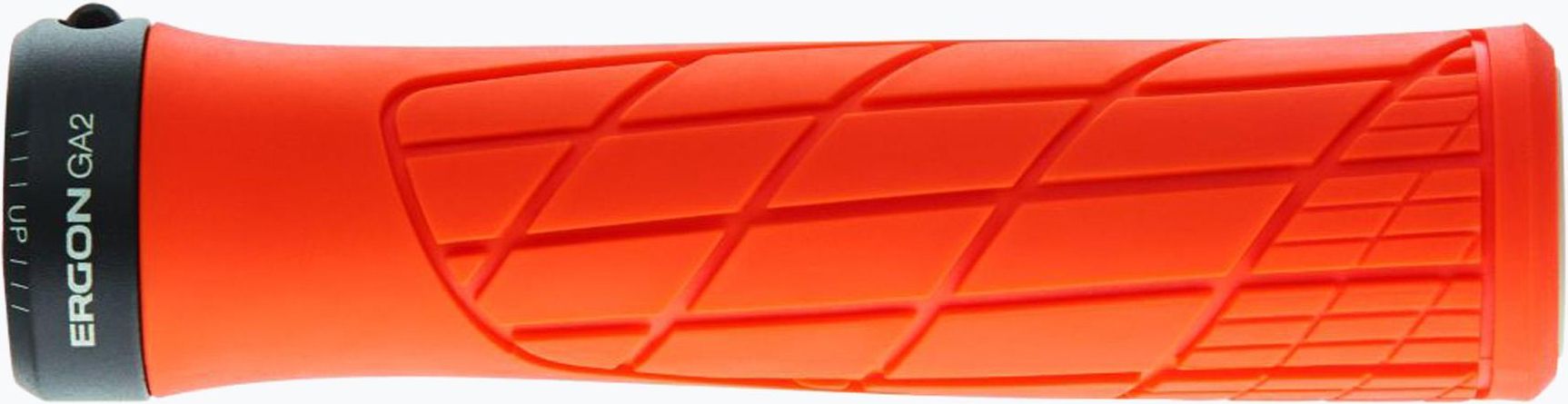 Chwyty Rowerowe Ergon GA2 Juicy Orange Ergon Popularne GA2 są teraz jeszcze bardziej wytrzymałe dzięki wymiennym końcówkom. Doskonała przyczepność dzięki super miękkiej, odpornej na promieniowanie UV mieszance gumy opracowanej w Niemczech wyłącznie dla Ergon. To sprawia, że masz dzięki temu najlepszą kontrolę na szlaku. Wewnętrzne aluminiowe zaciski oferują dużo przestrzeni, nawet dla osób z dużymi dłońmi. Zaciski na kierownicach z włókna węglowego mają maksymalną wytrzymałość na skręcanie. Rozmiar: jeden rozmiar Waga: ok. 110 g* Materiał: GravityControl Rubber Zacisk: Aluminium, anodowane na czarno Zastosowanie: MTB Tour / XC / Marathon / All-Mountain / Fitness Przyjazne dla dłoni Podczas jazdy na rowerze dłonie wspierają dużą część górnej części ciała na kierownicy. Powoduje to duży nacisk na mały obszar chwytu. Bardzo wrażliwy nerw łokciowy, który biegnie blisko powierzchni skóry w okolicy małego palca, jest często ściągany. Może to spowodować, że poczujesz się odrętwiały. Rękojeść skrzydełkowa zwiększa powierzchnię dłoni, rozkłada nacisk na większą powierzchnię i zapobiega dyskomfortowi. Doskonała przyczepność Priorytety wysokiej jakości materiałów to jedna z podstawowych wartości firmy Ergon. Miękka, trwała i czysta niemiecka guma o specyficznym układzie tekstur zapewnia duży komfort i kontrolę na rowerze. Dzięki wewnętrznemu zaciskowi dostępne jest więcej miejsca na szerszy chwyt. GA2 zapewnia ergonomiczny układ tekstury i tłumienie wibracji przy jednoczesnym zmniejszeniu napięcia podczas chwytania. ZACISK WEWNĘTRZNY Wewnętrzny aluminiowy zacisk serii GA2 pozostawia dużo miejsca dla szerokiego stylu chwytania. RDZEŃ WEWNĘTRZNY Grubość ścianki wewnętrznego rdzenia jest zwężona, co oznacza, że ma różne, precyzyjnie obliczone średnice, aby zoptymalizować komfort tłumienia uchwytów. Kolor: Pomarańczowy