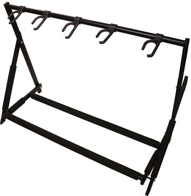 Hamilton KB5700G Stage Pro – stojak na 5 gitar. Idealny dla profesjonalnych muzyków, którzy posiadają wiele instrumentów. Może pomieścić do 5 instrumentów. Dedykowany zarówno do gitar akustycznych i elektrycznych, basowych, jak i do ukulele lub skrzypiec. gumowy zagłówek delikatnie i bezpiecznie trzyma instrument. Każdy zagłówek dopasowuje się do instrumentów o różnych szerokościach gryfu szyny mogą być rozmieszczone szeroko lub wąsko, tak aby pomieścić zarówno pełnowymiarowe instrumenty jak i mniejsze np. ukulele wyściełane dolne belki wspierają i zabezpieczają korpusy instrumentów górna szyna posiada regulację: od najwyższego ustawienia dla gitar i basów do najniższego dla ukulele i skrzypiec zagłówek może być ustawiony tak, aby pomieścić duże i małe instrumenty stojak posiada możliwość szybkiego złożenia, ułatwiając transport lub przechowywanie