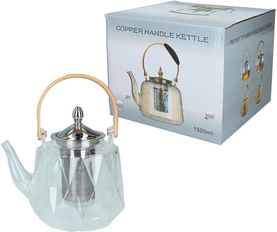 Szklany czajnik z zaparzaczem. Świetny do codziennego użytku, ale również dobrze się prezentuje podając go gościom na stół. Kolekcja: czajniki szklane Rozmiar: 1500ml Opakowanie: biały karton Liczba sztuk w opakowaniu: 24 Podgrupa: czajniki Tematyka: zielarstwo, zdrowie EAN: 5905450823894