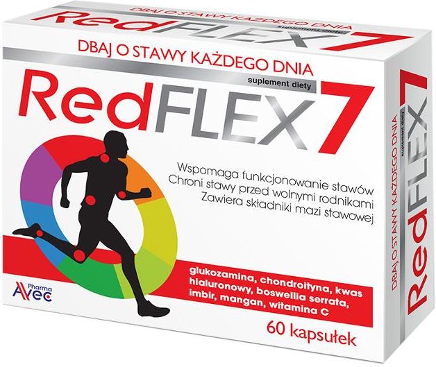 Red Flex7 suplement diety Opakowanie 60 kapsułek Przeznaczenie Wspomaga funkcjonowanie stawów, uczestniczy w tworzeniu tkanki łącznej stawów i kości - (mangan) Pomaga w prawidłowej produkcji kolagenu w celu prawidłowego funkcjonowania chrząstki i kości (wit.C) Zawiera składniki budulcowe chrząstek i mazi stawowej - glukozaminę, chondroitynę i kwas hialuronowy Właściwości GLUKOZAMINA,CHONDROITYNA,KWAS HIALURONOWY -główne składniki budulcowe tkanki łącznej, chrząstki orazmazi stawowej. Uczestniczą w biosyntezie proteoglikanów,nadają właściwości poślizgowe mazi, zmniejszają tarcie pomiędzy ruchomymi elementami stawów. BOSWELLIA SERRATA- Zawiera 65% kwasu boswelinowego, działa wspomagająco w utrzymaniu elastyczności i komfortu stawów. IMBIR Naturalny wyciąg roślinny działa wspomagająco w utrzymaniu ruchliwości stawów. MANGAN – Wspomaga funkcjonowanie stawów. Uczestniczy w procesach tworzenia tkanki łącznej w tym kości i chrząstek. Przyczynia się do utrzymania zdrowych kości, chroni przed działaniem wolnych rodników. WITAMINA C Pomaga w prawidłowej produkcji kolagenu w celu prawidłowego funkcjonowania chrząstki, kości oraz naczyń krwionośnych. Sposób użycia Dorośli 1-2kapsułkidziennie w trakcie lub po posiłku. Nie należy przekraczać zalecanej do spożycia porcji w ciągu dnia. Składniki siarczan glukozaminy 2KCl, otoczka – żelatyna, siarczan chondroityny, kwas L-askorbinowy – witamina C, wyciąg z korzenia imbiru (Zingiber officinale L. 10:1), wyciąg Boswellia serrata 65% kwasu bosweliowego, kwas hialuronowy, sól magnezowa kwasów tłuszczowych, substancja przeciwzbrylająca – dwutlenek krzemu, siarczan manganu, substancja wypełniająca – celuloza, barwnik – dwutlenek tytanu. Składnik1 kapsułka2 kapsułkiSiarczan glukozaminy 2KCl w przeliczeniu na czystą glukozaminę400 mg 237 mg800 mg 473 mgSiarczan chondroityny w przeliczeniu na czystą chondroitynę50 mg 44,33 mg100 mg 88,66 mgWitamina C40 mg (50%*)80 mg (100%*)Wyciąg z korzenia imbiru (0,5%-1% gingeroli)25 mg50 mgWyciąg boswellia serrata (65% kwasu bosweliowego)20 mg40 mgKwas hialuronowy5 mg10 mgmangan1 mg (50%*)2 mg (100%*)*%RWS- referencyjna wartość spożycia Informacje dodatkowe Produkt nie może być stosowany jako substytut zróżnicowanej diety. Zrównoważony sposób żywienia i zdrowy tryb życia są ważne dla utrzymania prawidłowego stanu zdrowia. Nie należy stosować w przypadku uczulenia na którykolwiek ze składników produktu. Produkt nie jest przeznaczony dla dzieci, kobiet w ciąży oraz karmiących piersią. Podmiot odpowiedzialny: Avec Pharma sp. z o.o. ul. Beżowa 2 54-046 Wrocław