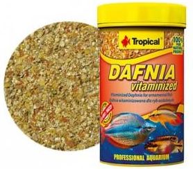 Dafnia Vitaminized to suszona na słońcu rozwielitka, wzbogacona o dodatek witamin. Linia Naturalna to pokarmy, w skład których wchodzą bezkręgowce. Ich cenne właściwości odżywcze zostały zachowane dzięki procesom liofilizacji lub suszenia. Dzięki temu zachowują swoje walory odżywcze i smakowe, jednocześnie nie stwarzając zagrożenia ze strony patogenów i organizmów chorobotwórczych. Piękne i zdrowe ryby w akwarium to wynik działania wielu czynników. Jednym z ważniejszych jest dobrze zbilansowana i dostosowana do potrzeb ryb dieta. Stosowanie wysokiej jakości pokarmów nie tylko dostarcza rybom niezbędnych składników odżywczych, ale też chroni akwarium przed nadmiernym obciążeniem produktami przemiany materii. Pokarmy Tropical są produkowane z najwyższej jakości surowców naturalnych. Receptura każdego z nich jest kwintesencją długoletniego doświadczenia, wiedzy i zamiłowania do ryb akwariowych. Rozwielitki (dafnie) to drobne skorupiaki słodkowodne, należące do podrzędu wioślarek ( Cladocera ). Pozyskiwane z czystych wód i suszone na słońcu rozwielitki stanowią cenny dodatek pokarmowy i urozmaicenie diety. Często jest to podstawowy pokarm ryb w środowisku naturalnym, dotyczy to zwłaszcza mniejszych gatunków lub podrastającego narybku. Dafnie są bogate w białko i zdrowe tłuszcze, stanowią również cenne źródło chityny - substancji balastowej która poprawia perystaltykę jelit i zapobiega zaparciom u ryb. Oprócz tego, pokarm został dodatkowo wzbogacony o zestaw witamin co znacząco wpływa na witalność i zywotność karmionych zwierząt. - naturalny, bogaty w białko pokarm wzbogacony o zestaw witamin - idealny pokarm dla mniejszych gatunków ryb - poprawia perystaltykę jelit, zapobiega wzdęciom