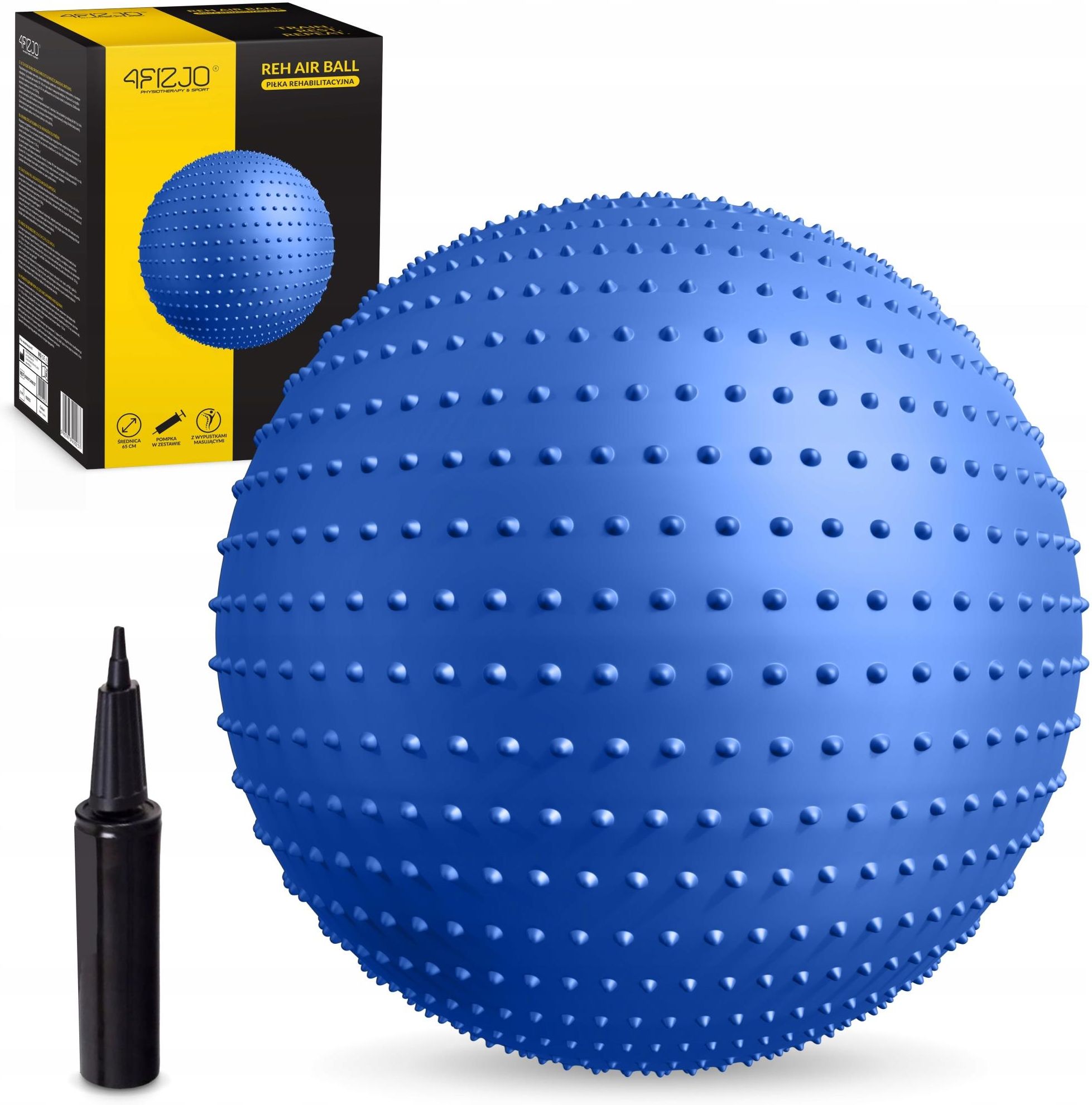 PIŁKA GIMNASTYCZNA REHABILITACYJNA Z WYPUSTKAMI DO ĆWICZEŃ FITNESS POMPKA Piłka rehabilitacyjna sensoryczna 65 cm 4FIZJO z wypustkami niebieska Znamy świetny sposób na poprawę kondycji po kontuzjach i mobilizację mięśni głębokich! Chcesz wiedzieć jaki? Wybierz piłkę rehabilitacyjną z wypustkami sensorycznymi! Postaw na skuteczny trening zarówno rehabilitacyjny, jak i fizjoterapeutyczny. Zobaczysz, jak dzięki temu niepozornemu przedmiotowi, zyskasz wiele korzyści dla zdrowia fizycznego i psychicznego. Nie przegap okazji i już teraz sprawdź ofertę specjalistycznej piłki gimnastycznej z kolcami 65 cm 4FIZJO! Piłka gimnastyczna z wypustkami sensorycznymi 65 cm Gimnastyczna piłka sensoryczna do ćwiczeń 4FIZJO jest przeznaczona do masażu i rehabilitacji, a także gimnastyki korekcyjnej. Pomaga też rozluźnić napięte mięśnie i złagodzić ból. Sprawdź cechy produktu i dopasuj model do własnych potrzeb. Parametry Kolor: niebieski Materiał: PVC Średnica piłki: 65 cm System anti-burst: tak W zestawie: pompka z systemem pull & push Wyrób Medyczny ✅ Zalety sensorycznej piłki rehabilitacyjnej z wypustkami Wskazane jest jej używanie przy rehabilitacji. Piłka rehabilitacyjna pomaga zwiększyć ruchomość w stawach. Stosowana jest przy ćwiczeniach poprawiających koordynację ruchową i równowagę. Dodatkowe wypustki sensoryczne pobudzają receptory czuciowe, zapewniając przyjemny masaż. Piłka do ćwiczeń jest wykonana z wytrzymałego materiału. Piłkę można szybko napompować. Jest łatwa w czyszczeniu. Różnorodne zastosowanie rehabilitacyjnej piłki do ćwiczeń Sensoryczna piłka do ćwiczeń 4FIZJO idealnie sprawdzi się przy ćwiczeniach rehabilitacyjnych i terapeutycznych. Piłki gimnastyczne z kolcami65 cm są: Stosowane w terapii pourazowej, integracji sensorycznej, gimnastyce korekcyjnej Pomocne w łagodzeniu dolegliwości bólowych w obrębie kręgosłupa Wykorzystywane w leczeniu schorzeń kostno-stawowych Niezastąpione przy ćwiczeniach ogólnorozwojowych i wzmacnianiu mięśni grzbietu i brzucha Ważne dla zwiększenia mobilności ciała i aktywizacji stawów Pomocne przy korygowaniu wad postawy Istotne przy poprawie krążenia krwi i pobudzenia receptorów czuciowych Stosowane przy zabawach z dziećmi z różnymi rodzajami niepełnosprawności Polecane również kobietom w ciąży Piłka gimnastyczna z kolcami – niezbędnik w rehabilitacji Piłka rehabilitacyjna sensoryczna jest jedną z kilku rodzajów piłek gimnastycznych. Wyróżniają ją dodatkowe, lekko sztywne, gumowe kolce niepowodujące bólu. Znajdują się one na całej powierzchni piłki. Wypustki sensoryczne zapewniają przyjemne rozluźnienie i doznania akupresurowe. W ten sposób stymulowane są napięte mięśnie. Taka forma masażu mięśniowo-powięziowego pobudza receptory czuciowe i poprawia ukrwienie organizmu. Tym samym uzyskany optymalny ucisk pozwala zmniejszyć napięcia nerwowe czy ból. Piłka gimnastyczna do ćwiczeń 4FIZJO jest wykonana z wytrzymałego materiału. Jest on bezpieczny w użytkowaniu i łatwy w czyszczeniu. Przed podjęciem ćwiczeń rehabilitacyjnych skonsultuj się z lekarzem lub fizjoterapeutą. Pomogą dobrać Ci odpowiednie ćwiczenia. Jak dobrać rozmiar gimnastycznej piłki sensorycznej 4FIZJO? Żeby piłka gimnastyczna mogła spełnić swoje zadanie, jej rozmiar musi być odpowiednio dobrany. Po pierwsze, musi pasować do wzrostu. Po drugie, siedząc na piłce, twoje biodra nie powinny być niżej niż kolana. Powinny one tworzyć kąt 90° lub nieco większy. Zapoznaj się z poniższymi wymiarami w celu wybrania pasującego rozmiaru piłki gimnastycznej: 55 cm: 141-150cm 65 cm: 151-165cm 75 cm: 166-175cm 85 cm: 176-190 cm Właściwie dobrana średnica piłki do wzrostu decyduje o efektywności treningu. Ma to znaczący wpływ na technikę wykonywanych ćwiczeń korekcyjnych i rehabilitacyjnych. Jak napompować piłkę gimnastyczną 4FIZJO? Do napełnienia piłki gimnastycznej powietrzem wykorzystaj ręczną pompkę, dołączoną do zestawu. Aby napompować piłkę rehabilitacyjną: Włóż końcówkę pompki do otworu w piłce i pompuj ją aż piłka zostanie wypełniona powietrzem w 95% Jeśli jest to nowa piłka, napompuj ją najpierw w ok. 85% i odczekaj dobę. Po 24 godzinach dopompuj piłkę do ok. 95%. Uwaga: Pamiętaj, żeby nie pompować piłki gimnastycznej w 100%. Grozi to pęknięciem piłki.