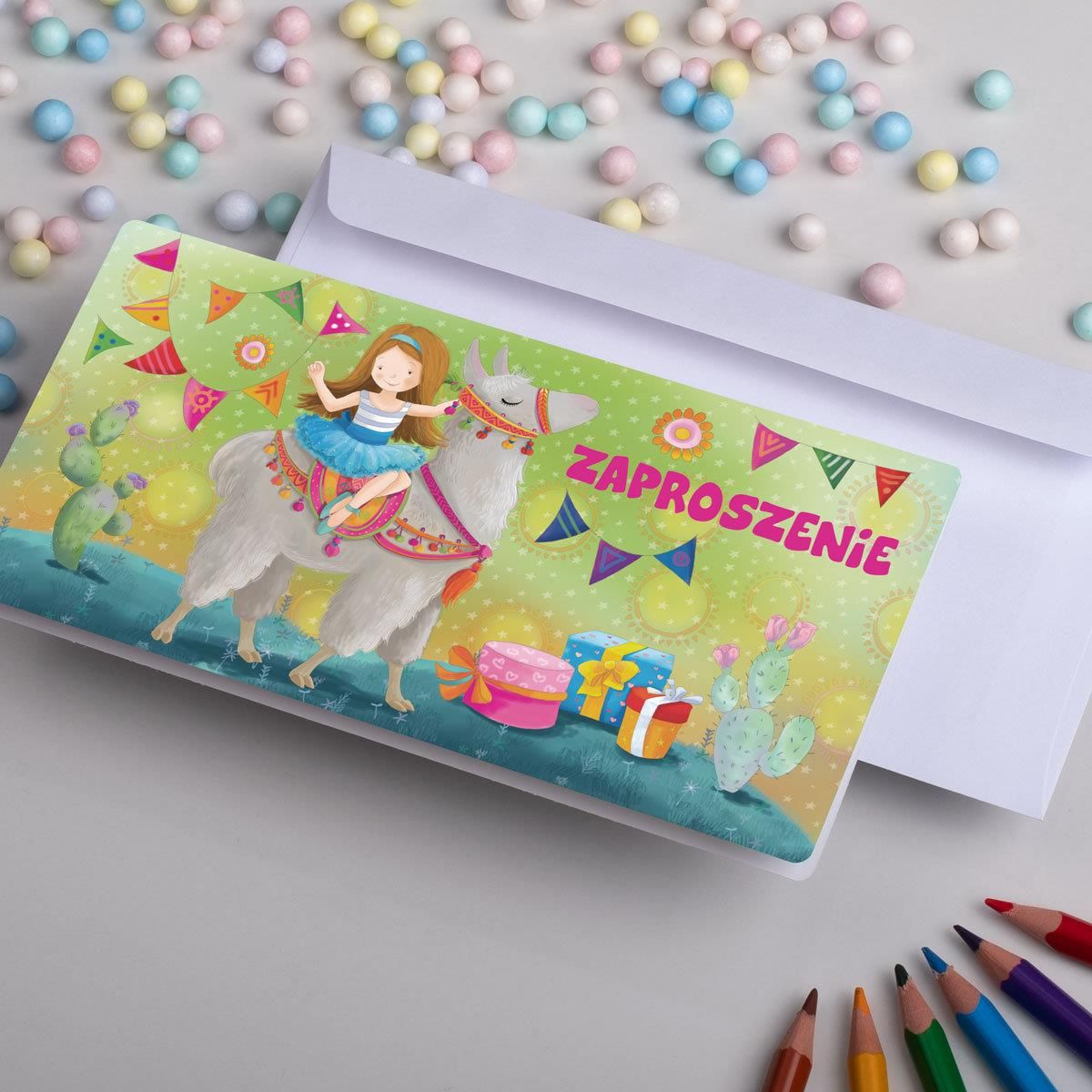 - piękne kolorowe zaproszenia dziecięce - wydrukowane na szlachetnym papierze - pakowane po 10 sztuk z białą kopertą - wymiar zaproszenia to 17cm x 8,5 cm