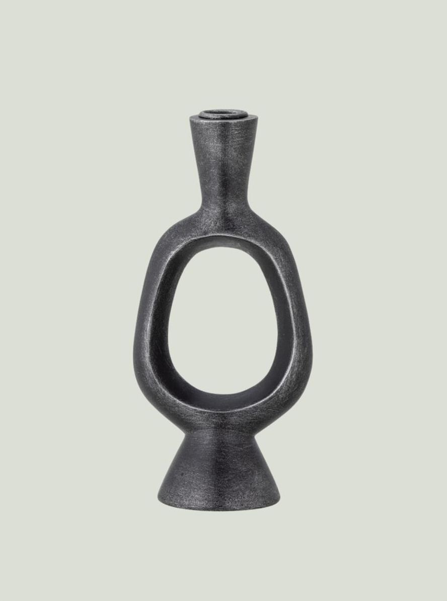Świecznik Bijan firmy Bloomingville wykonany jest z żywicy poliestrowej. Ma czarny i surowy metaliczny wygląd. Wysokość: 23,5 cm Długość: 11 cm Szerokość: 7,5 cm