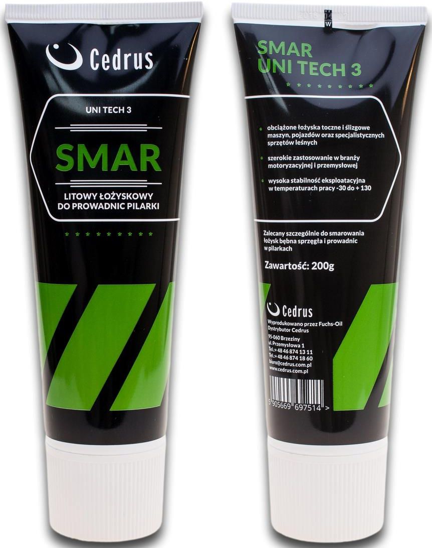 CEDRUS UNI TECH 3 SMAR LITOWY ŁOŻYSKOWY DO SMAROWANIA ŁOŻYSK I PROWADNIC Produkt przeznaczony jest między innymi do smarowania łożyska zębatki prowadnic pilarek spalinowych i elektrycznych. Regularne smarowanie zwiększa żywotność prowadnicy