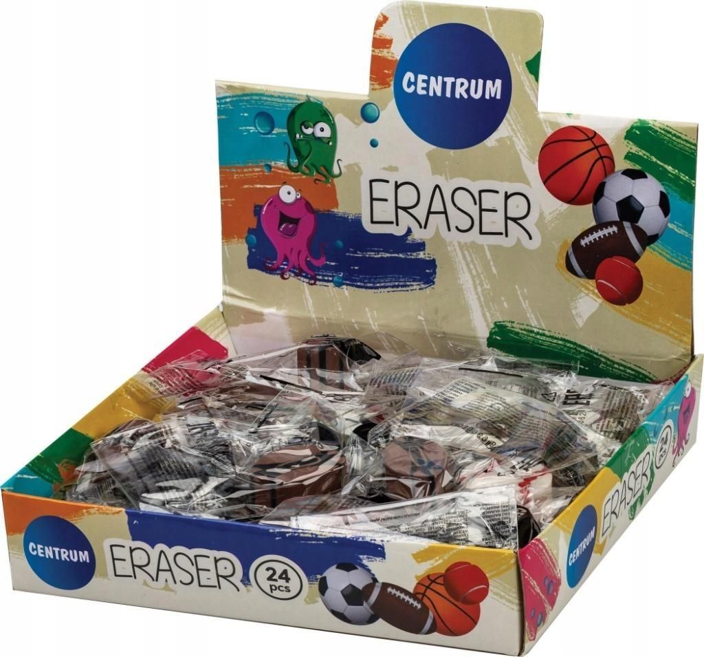 GUMKA Do Ścierania Ołówka Przybory SZKOLNE Dla Ucznia Gumka ball 25x25 mm Producent: Centrum różne kształty z nadrukami piłek osobno pakowane w folię rozmiar: 27 x 27 x 13 mm pakowanie: display 24 szt