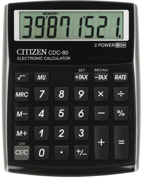 CITIZEN jest najbardziej rozpoznawalną marką na rynku kalkulatorów w Polsce i na świecie. Jest to wiodący producent w tym segmencie i niekwestionowany lider w pionierskich rozwiązaniach dla branży urządzeń liczących. Kalkulator biurowy CITIZEN CDC-80 BKWB, 8-cyfrowy, 135x80mm, czarny kalkulator z 8-cyfrowym wyświetlaczem podwójny system zasilania (bateria słoneczna i baterie) stały kąt nachylenia wyświetlacza wymiar: 135x108x24mm funkcja pierwiastka kwadratowego, obliczania procentów oraz podatków zasada pełnych kosztów wyposażony w klawisz zmiany znaku wyłącza się automatycznie 2 lata gwarancji kolor: czarny