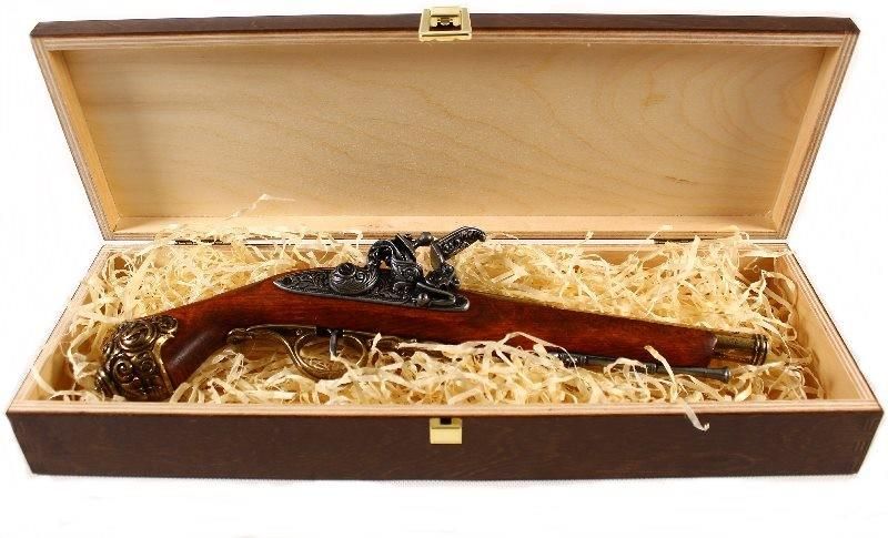 REPLIKA PISTOLETU SKAŁKOWEGO z VIII wieku W PUDEŁKU DENIX MODEL 1077L+P02 DANE TECHNICZNE: Wierna replika W PUDEŁKU skałkowego pistoletu z VIII wieku, wykonana z tzw. znalu i drewna. Wykończona elementami metalowymi z bogatymi zdobieniami w kolorze starego złota i srebra. Replika posiada ruchomy …