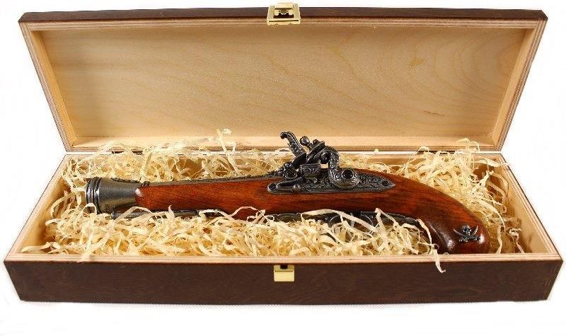 REPLIKA PIRACKIEGO GARŁACZA LEWORĘCZNEGO W PUDEŁKU DENIX MODEL 1126G+P02 DANE TECHNICZNE: Replika pirackiego garłacza z XVIII wieku W PUDEŁKU. Pięknie inkrustowana lufa z lekko rozszerzanym wylotem pozwalającym na powiększenie pola rażenia. Broń idealna w walce przy małych odległościach, ulubiona przez piratów podczas stosowania abordażu. Zwraca na siebie uwagę misternie wykonanym mechanizmem spustowym, oraz ornamentem w postaci trupiej czaszki, nad skrzyżowanymi szablami.Ten pistolet zachwyci każdego kto interesuje się marynistyką i bitwami na morzu. Cena zawiera: pistolet i pudełko. Materiał: cynk, aluminium, drewno afrykańskie; pudełko: drewno Waga pistoletu: 550g Długość pistoletu: 38cm Kolor: stare srebro z brązem; pudełko: brąz Producent : DENIX SA Hiszpania UWAGA: Nie strzela na żadne kulki itp. Proponowane repliki hiszpańskiej firmy Denix wykonane są ze specjalnych miękkich stopów co uniemożliwia ich przekalibrowanie. HISTORIA: Garłacz został skonstruowany w XVI wieku w Holandii jako broń dla marynarzy. Rozszerzenie wylotu lufy (zwane trąbą) miało ułatwić ładowanie broni na rozchwianym pokładzie, uważano także, że takie rozszerzenie zwiększa rozrzut śrutu. W rzeczywistości rozszerzenie nie ma wpływu na rozrzut. Łatwość ładowania i możliwość zamiennego używania kul i śrutu sprawił, że garłacze rozpowszechniły się w Europie. Trafiły między innymi do uzbrojenia włoskiej lekkiej jazdy, załóg weneckich galer i hiszpańskich strzelców. Później stały się głównie bronią jazdy, i w tej roli rozpowszechniły się na Bliskim Wschodzie, Persji i na Kaukazie.