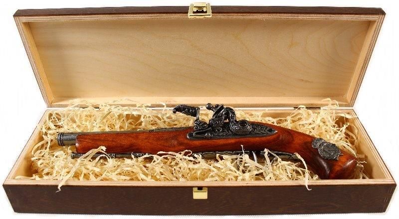 REPLIKA NAPOLEOŃSKIEGO PISTOLETU SKAŁKOWEGO W PUDEŁKU DENIX MODEL 1127L+P02 DANE TECHNICZNE: Prezentowana replika W PUDEŁKU bardzo dokładnie odzwierciedla oryginał napoleońskiego leworęcznego pistoletu skałkowego z XIX wieku. W całości wykonana z metalu oraz drewna. Na rękojeści osadzono napoleońską pieczęć z mosiądzu. Drewniane łożysko oraz elementy mechanizmu ozdobiono charakterystycznymi motywami roślinnymi. Mechanizm wyposażony w ruchomy spust oraz kurek pozwala oddać suchy strzał. Cena zawiera: pistolet i pudełko. Materiał: drewno, metal; pudełko: drewno Wymiary pistoletu: 39 cm Waga pistoletu: 632 g Kolor: stare srebro i złoto z brązem; pudełko: brąz Producent : DENIX SA Hiszpania HISTORIA: Napoleoński pistolet skałkowy z 1806 roku stworzony przez Jeana Baptista Vaquetta de Gribeauva, słynnego oficera i inżyniera, który wprowadził liczne udoskonalenia w uzbrojeniu francuskiej armii, z powodzeniem wykorzystane podczas wczesnych lat wojen napoleońskich. Pistolety skałkowe, które zastąpiły broń opartą o zawodny mechanizm kołowy, były pierwszą tego typu skuteczną bronią. Jednak w XIX zostały wyparte przez doskonalszy mechanizm kapiszonowy oraz, od połowy stulecia, broń odtylcową.