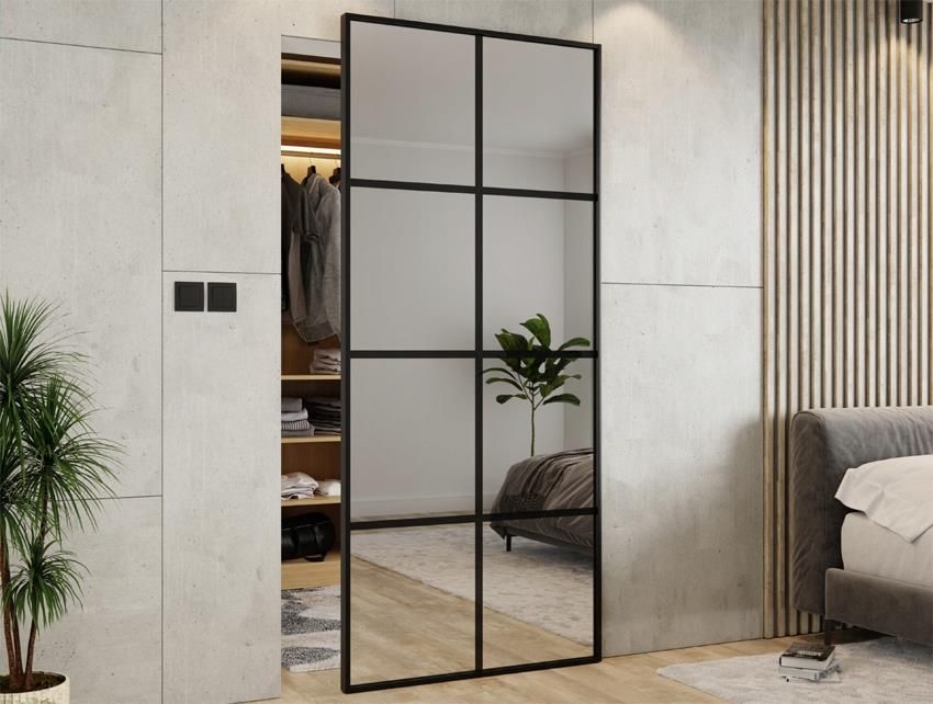 5905811821361 Drzwi Przesuwne w ramie aluminiowej wraz z NIEWIDOCZNYM systemem przesuwnym. Wypełnienie LUSTRO SREBRNE z czarnymi aplikacjami z dwóch stron. Wysokość skrzydła: 220 cm Szerokość skrzydła: 112,5 cm Grubość skrzydła: 30 mm Drzwi przesuwne z Lutrem są perfekcyjnym rozwiązaniem dla …
