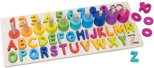 Układanka puzzle alfanumeryczna - litery i cyfry Nauka podczas zabawy? Zabawa podczas nauki? Oczywiście. Ta edukacyjna tablica w formie układanki to doskonałe wsparcie dla dziecka podczas nauki literek i cyferek. To doskonałe narzędzie, które łączy w sobie funkcje edukacyjne z rozrywką, wspierając przy tym rozwój umiejętności matematycznych oraz językowych u maluchów. Posiada ona wszystko co potrzebne: wyjmowane klocki z cyframi od 1 do 10 oraz litery alfabetu. Do tego na środku podstawy znajduje się 10 palików ze zdejmowanymi krążkami w ilości pasującej do kolorystycznie przypisanej im cyfry. I tak na paliku znajdującym się przy cyfrze 8 znajduje się 8 kolorowych krążków itd. Taka forma aktywności i zabawy wspaniałe wsparcie w różnych aspektach dziecięcego rozwoju Rozwój umiejętności matematycznych - Pomaga w nauce liczenia, dodawania i odejmowania, a także rozpoznawaniu i porównywaniu ilości. Układanie krążków na palikach rozwija zrozumienie podstawowych pojęć matematycznych, Rozwój umiejętności językowych - Ułatwia naukę alfabetu oraz rozpoznawanie liter, co stanowi solidny fundament dla przyszłych umiejętności czytania i pisania. Dziecko może ćwiczyć literowanie prostych słów, Rozwój poznawczy - Maluch uczy się rozwiązywać problemy poprzez dopasowywanie elementów, co wspiera rozwój logicznego myślenia i umiejętności rozwiązywania problemów. Rozwój sensoryczny - Kolorowe elementy i różne kształty stymulują zmysły dziecka, wspierając rozwój percepcji wzrokowej oraz dotykowej, Rozwój społeczny i emocjonalny - Zabawa w grupie sprzyja nauce współpracy, dzielenia się i komunikacji, co jest ważne dla rozwoju umiejętności społecznych. Wesołe kolory nie tylko ożywiają zabawkę, ale także uczą dzieci rozpoznawania i nazywania różnych barw. Dzięki takim zabawom dzieci mogą łatwiej przyswajać nowe informacje, co czyni naukę przez zabawę efektywną i przyjemną. Nasza układanka jest idealna do użytku zarówno w domu, jak i w placówkach edukacyjnych takich jak przedszkola, szkoły czy świetlice. Jest również świetnym pomysłem na prezent, który z pewnością ucieszy każde dziecko. Główne zalety produktu: Komplet zawiera aż 91 elementów: drewnianą podstawę o wymiarach 42,5 x 18 x 1cm, 10 palików, klocki w formie liter bez polskich znaków ( 26szt) oraz cyfr od 1 do 10, 55 kolorowych krążków, Zapakowane w ładne i kolorowe pudełko, dzięki czemu idealnie nadaje się na prezent, Przeznaczonedla dzieci 3+ Wykonana zbezpiecznych materiałów - deklaracja zgodności CE