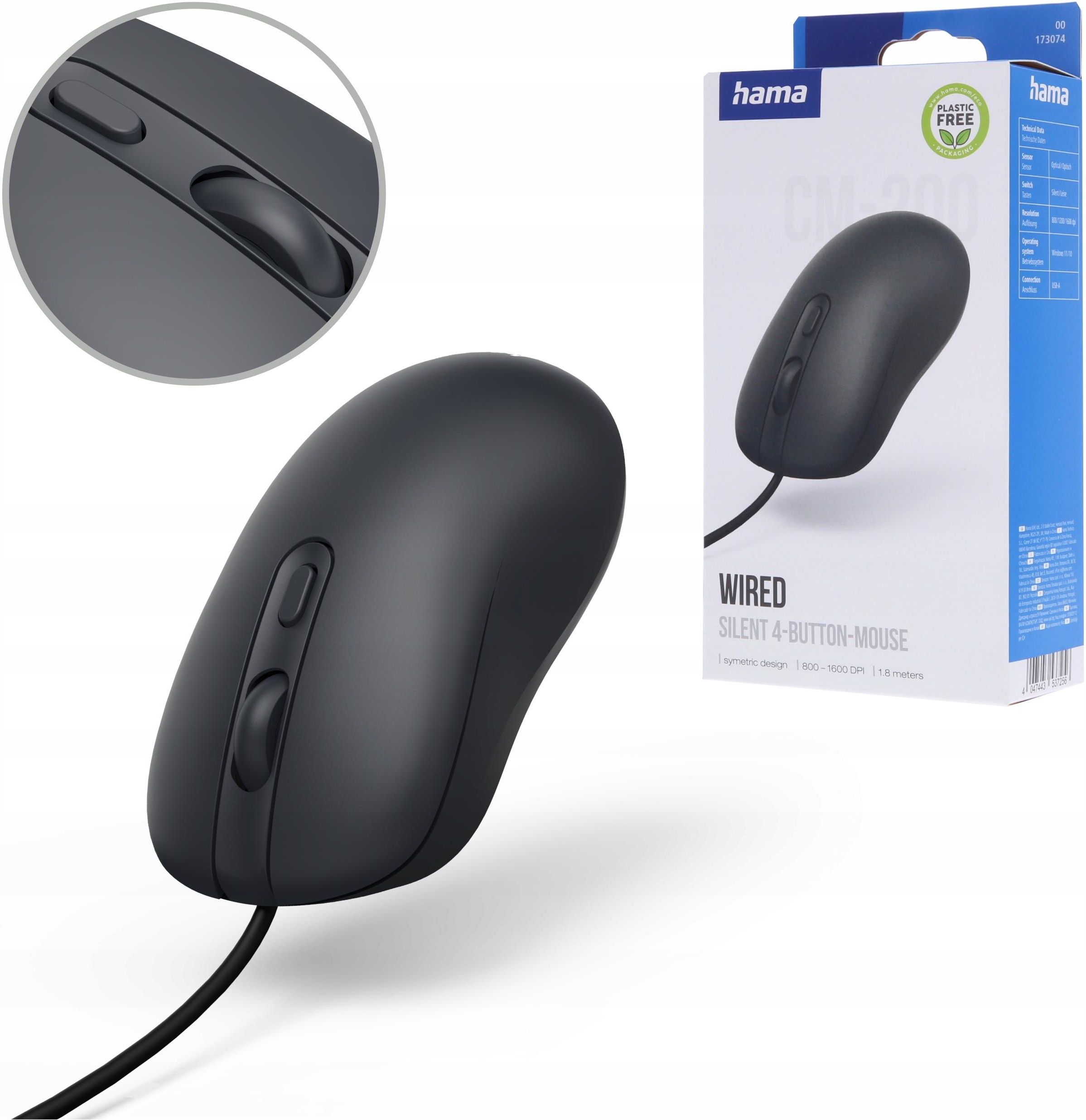 173074 Równowaga i precyzja Funkcjonalności 4 przyciski i rolka przewijania dla wygodnej obsługi Symetryczny kształt dla prawo- i leworęcznych Ciche przyciski bez odgłosów klikania Wykonanie w 65% z plastiku z recyklingu Przełącznik DPI: 1000 / 1600 / 2000 Gumowana rolka i ślizgacze polimerowe dla płynnych ruchów Kabel USB 1,8 m z rzepem do porządkowania przewodów Opakowanie w 100% bez plastiku Komfort bez hałasu Dzięki cichym przyciskom możesz pracować w skupieniu, bez rozpraszających kliknięć. To idealne rozwiązanie dla osób, które spędzają wiele godzin przy komputerze i cenią sobie ciszę oraz spokojne otoczenie. Wygoda w każdej dłoni Symetryczny kształt sprawia, że myszka pasuje zarówno dla osób prawo-, jak i leworęcznych. Dzięki temu nie musisz wybierać - urządzenie po prostu dopasowuje się do Twoich potrzeb i zapewnia ergonomiczne użytkowanie w każdej sytuacji. Płynne i precyzyjne ruchy Polimerowa powierzchnia gwarantuje nieprzerwaną pracę, a gumowana rolka zapewnia lepszy chwyt i kontrolę. Dodatkowo możliwość wyboru DPI 1000, 1600 lub 2000 pozwala dostosować precyzję kursora do różnych zadań - od codziennej pracy po dokładniejsze projekty. Ekologiczny wybór Obudowa i przyciski wykonane są w 65% z plastiku z recyklingu, a opakowanie nie zawiera ani grama plastiku. Kupując tę myszkę, stajesz się częścią przyjaznego środowisku cyklu, dbając o planetę bez rezygnowania z jakości. Prosta obsługa i porządek Długi, 1,8-metrowy kabel USB zapewnia swobodę ruchów, a dołączone rzepy pozwalają szybko uporządkować przewód. Dzięki funkcji Plug and Play mysz działa od razu po podłączeniu - bez instalowania dodatkowych sterowników. Specyfikacja Kolor: czarny Kształt: dla osób prawo- i leworęcznych Podłączenie: wtyczka USB typu A Podłączenie: kabel Zakres DPI: 1000 / 1600 / 2000 Kompatybilne systemy operacyjne: Windows 11 / 10 Liczba przycisków myszy: 4 Szerokość x wysokość x głębokość: 5,8 x 3,5 x 10,3 cm Waga: 97 g Długość kabla: 180 cm Dlaczego Hama? Jesteśmy niemieckim producentem i dystrybutorem akcesoriów oraz sprzętu elektronicznego. Działamy w wielu obszarach, śledzimy trendy technologiczne i już od niemal 100 lat tworzymy rozwiązania, które sprawiają, że codzienne życie jest po prostu łatwiejsze. Artykuły Hama to niezawodne i certyfikowane produkty, które poddawane są restrykcyjnym testom przez nasz wewnętrzny dział zapewnienia jakości. Posiadają wszystkie wymagane prawem certyfikaty, dopuszczające je do handlu w Polsce, m.in. CE (zgodność z unijnymi normami) oraz TÜV (niemiecka jednostka certyfikująca). W konsekwencji wszystkie nasze produkty są w pełni bezpieczne dla użytkowników. Myślisz poważnie o akcesoriach, pomyśl o produktach Hama. Bez względu na to, jakie urządzenie posiadasz, z pewnością mamy do niego funkcjonalne uzupełnienie.