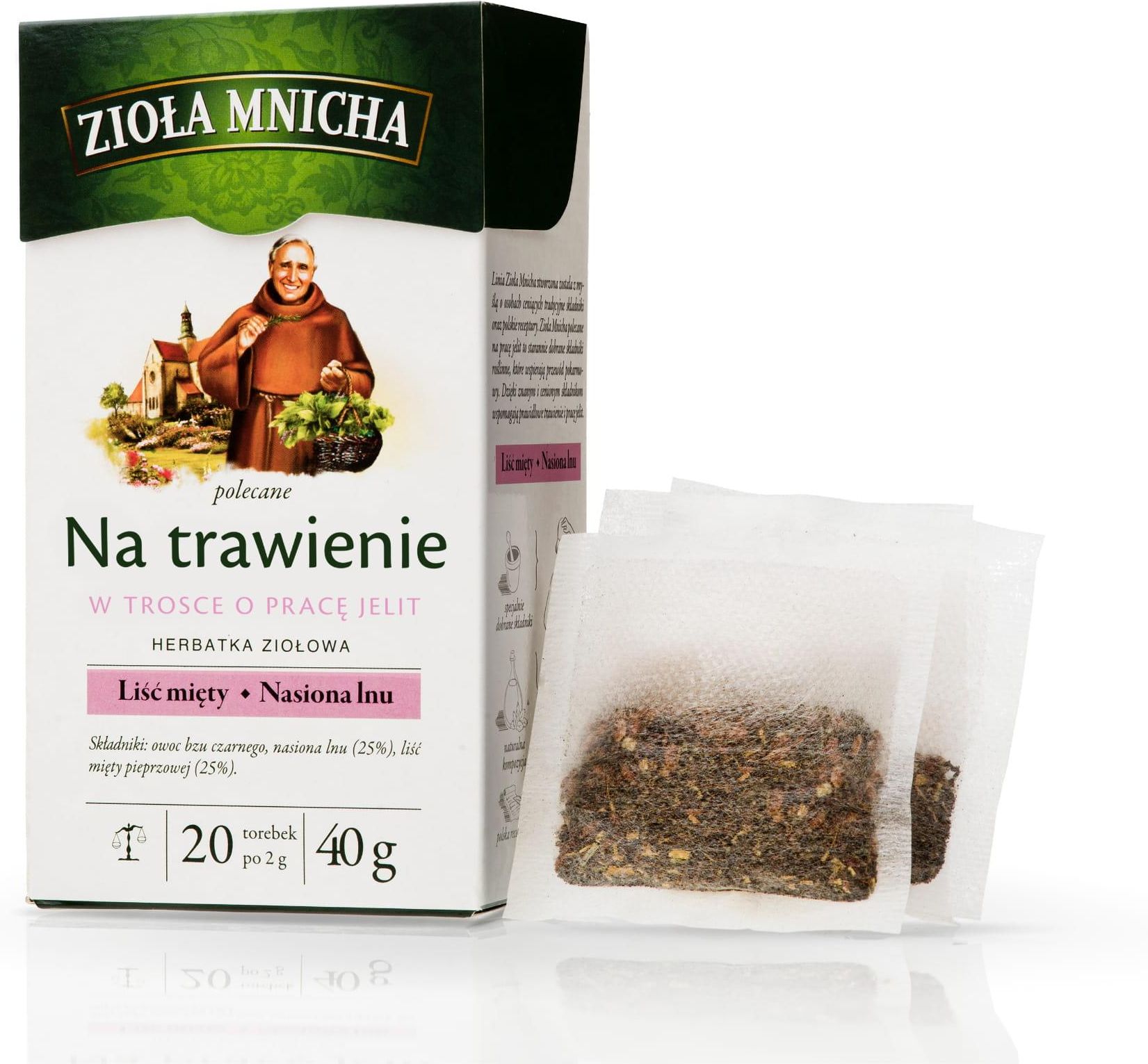 Zioła mnicha na trawienie Opakowanie zawiera 20 saszetek po 2g Producent: Herbapol-Lublin Herbatka ziołowa "Na Trawienie" to zestawienie 3 naturalnych składników: 1. Len (25%) – zawiera substancje śluzowe, które powlekają przewód pokarmowy. Wspomaga regularną pracę jelit i pasaż jelitowy, przez co wspiera ich oczyszczanie. Korzystnie wpływa na prawidłowe trawienie. 2. Liść mięty pieprzowej (25%) – wspomaga naturalne procesy trawienne i pracę jelit, przyczyniając się do prawidłowego funkcjonowania układu pokarmowego. Wykazuje właściwości rozkurczowe i wspomaga prawidłowe ruchy perystaltyczne jelit, dzięki czemu przyczynia się do usuwania uczucia pełności i wzdęć. 3. Owoc bzu czarnego Zawartość opakowania: 40 g (20 torebek x 2 g) Wartość odżywcza w 100 ml: Wartość energetyczna - 1 kJ (0 kcal), Węglowodany: Wartość odżywcza w naparze z 3 torebek po 2g (zalecana dzienna porcja): Wartość energetyczna - 4 kJ (1 kcal), Węglowodany: Zawiera znikome ilości tłuszczu (w tym kwasów tłuszczowych nasyconych) i soli. Zawartość opakowania: 40 g (20 torebek x 2 g) Środki ostrożności: Produkt nie jest wskazany dla kobiet w ciąży i matek karmiących piersią. Nie stosować u osób uczulonych na którykolwiek ze składników produktu. Zrównoważona i zróżnicowana dieta oraz zdrowy styl życia są podstawą zapewnienia prawidłowego funkcjonowania organizmu. Przechowywać w suchym miejscu. Chronić od światła. Sugerowane dawkowanie: Korzystny efekt wynikający z deklarowanego działania występuje w przypadku spożycia naparu z 3 torebek dziennie. Napar z 3 torebek po 2 g (zalecana dzienna porcja) zawiera: Liść mięty pieprzowej - 1,5 g, Nasiona lnu - 1,5 g; po terminie