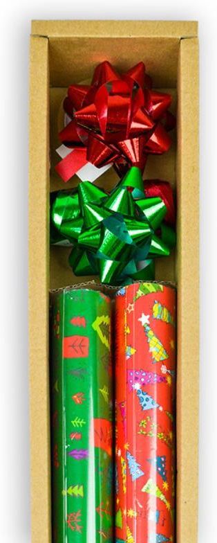 Świąteczny zestaw do pakowania prezentów, choinki Zakup prezentu to już połowa sukcesu. Ale prezent pięknie zapakowany sprawi obdarowanemu znacznie więcej radości. Dlatego przygotowaliśmy zestaw, który zawiera wszystko, czego potrzebujesz, żeby ten efekt osiągnąć. W jednym pudełku znajdziesz papiery i dodatki, dzięki którym przygotujesz nawet dwa różne świąteczne prezenty, ze specjalnie dobranymi do nich ozdobami! Potrzebujesz jeszcze tylko nożyczek i... gotowe! - w zestawie: dwie rolki papieru 68 x 98 cm, dwie wstążki, dwie rozetki i taśma klejąca - gramatura papieru 80 g/m2 - druk offsetowy