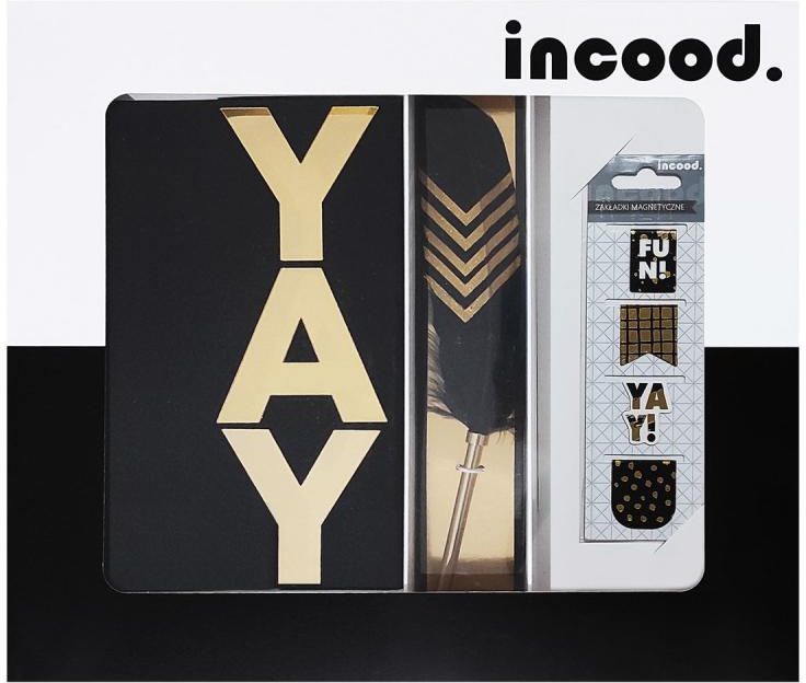 - zestaw piśmienniczy z kolekcji Gold Blast - elegancja w klasycznym czarno-złotym wydaniu - całość zapakowana w gustowne pudełko prezentowe - zestaw zawiera: metalowy złoty długopis z imitacją ptasiego pióra w kolorze czarnym, notes A5, 96 kartek w kratkę, ze sztywną okładką zapinana na magnes, zakładki magnetyczne do książek lub notatek