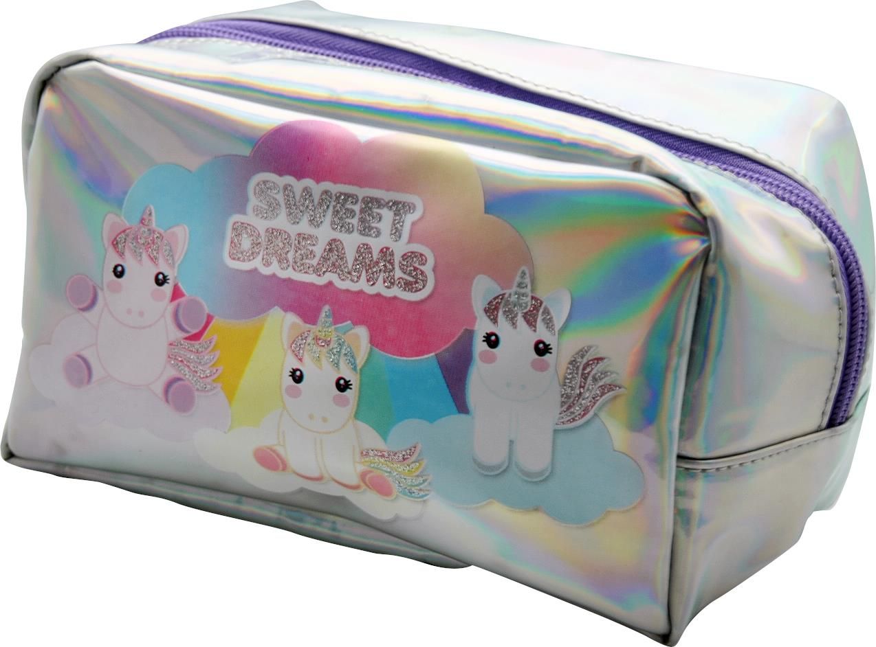 Poznaj uroczą kosmetyczkę Sweet Dreams z motywem jednorożców, idealną dla małych księżniczek! Wykonana z połyskującego, srebrnego materiału PU, przyciąga uwagę swoim bajkowym wzorem i praktycznym designem. Kompaktowy rozmiar pozwala na przechowywanie drobnych kosmetyków, akcesoriów czy skarbów, które dzieci uwielbiają mieć zawsze pod ręką. Kosmetyczka jest lekka, trwała i łatwa do czyszczenia, co czyni ją idealną zarówno do codziennego użytku, jak i na wyjazdy. To doskonały wybór na prezent, który sprawi radość każdej małej marzycielce. Wymiary: 18 x 11 x 11 cm