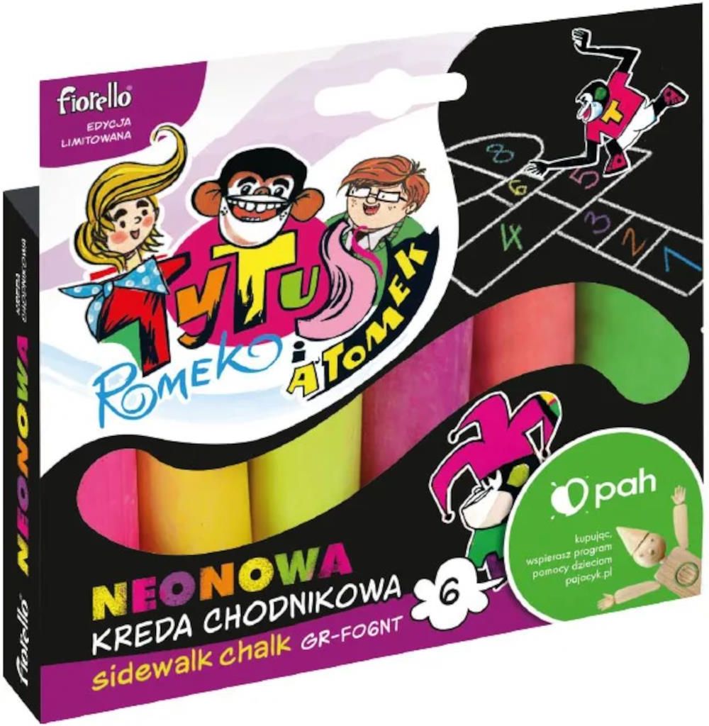 Kreda chodnikowa neon Tytus 6 kolorów FIORELLO: 6 neonowych kolorów w opakowaniu, grube pałeczki o przekroju okrągłym, średnica 2-2,5 cm, długość min. 10,5 cm. Wymiary: 145x137 mm Opakowanie: blister