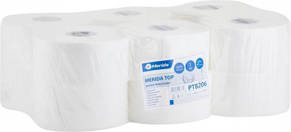 Merida PTB206 Papier toaletowy TOP, biały, średnica 19 cm, długość 120 m, d Merida Papier toaletowy MERIDA TOP, biały, średnica 19 cm, długość 120 m, dwuwarstwowy, zgrzewka 12 szt. Wykonany z 100% celulozy. Kolor biały. Dwuwarstwowy, miękki. Papier toaletowy posiada świadectwo jakości zdrowotnej PZH (B-BŻ-6071-0176/19/C). Posiada certyfikaty ekologiczne FSC i EU Ecolabel: PL/004/011. surowiec: 100% celuloza kolor: Biały ilość warstw: 2 białość (%): 84 długość wstęgi (m): 120 szerokość wstęgi (cm): 9 średnica (cm): 19 średnica gilzy (cm): 6 perforacja: tak, co 25 cm ilość listków w rolce: 480 gofrowanie: tak odporność na wodę: nie ilość w opakowaniu (szt): 12 ilość na palecie: 48 zgrzewek Papier toaletowy MERIDA TOP, biały, średnica 19 cm, długość 120 m, dwuwarstwowy, zgrzewka 12 szt.