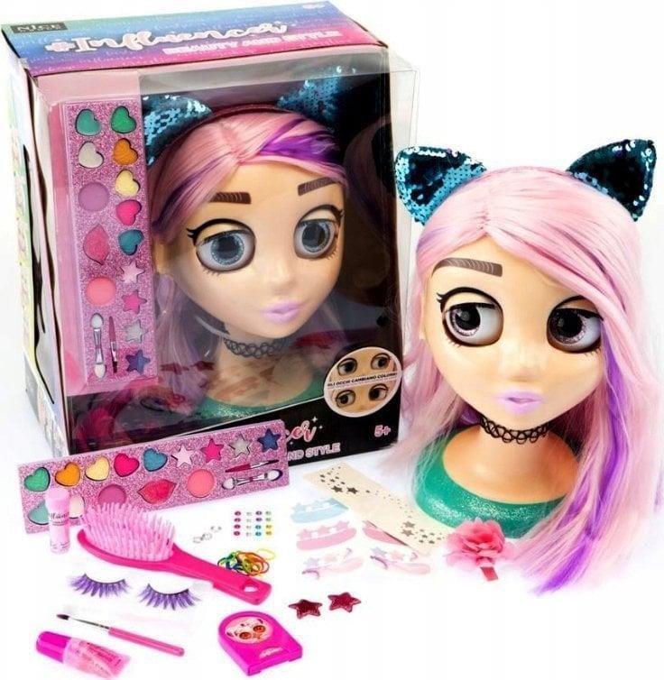Influencer Lalka do makijażu zmieniająca kolor oczu Głowa na przyssawkach ułatwiających zabawę 4 kolory oczu Długie włosy: 30 cm Opaska cekinowa Zestaw do make up: paletka cieni, naklejki na twarz, sztuczne rzęsy, pyłek błyszczcący, szczotka, gumeczki, błyszczyk, pędzelek, gumeczki na włosy, farbka …