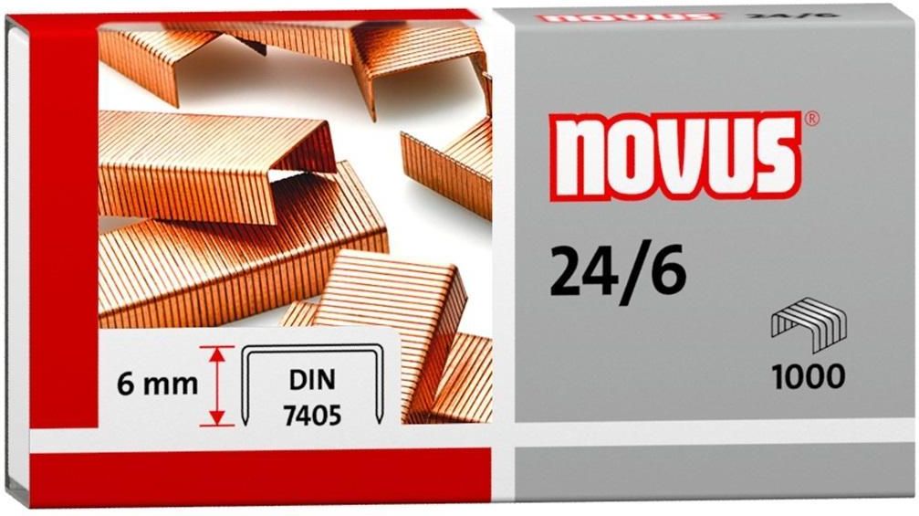 Zszywki Novus 24/6. Miedziowane w sposób przyjazny dla środowiska - precyzyjnie wykonane, spełniają wymogi DIN 7405. Zszywki wykonane ze stali, zaostrzone na końcach - przeznaczone do zszywaczy biurowych. Wysokość nóżki: 6 mm. Umożliwiają zszycie do 25 arkuszy standardowego papieru (80g/m2). Opakowanie zawiera 1000 szt. EAN: 4009729059135