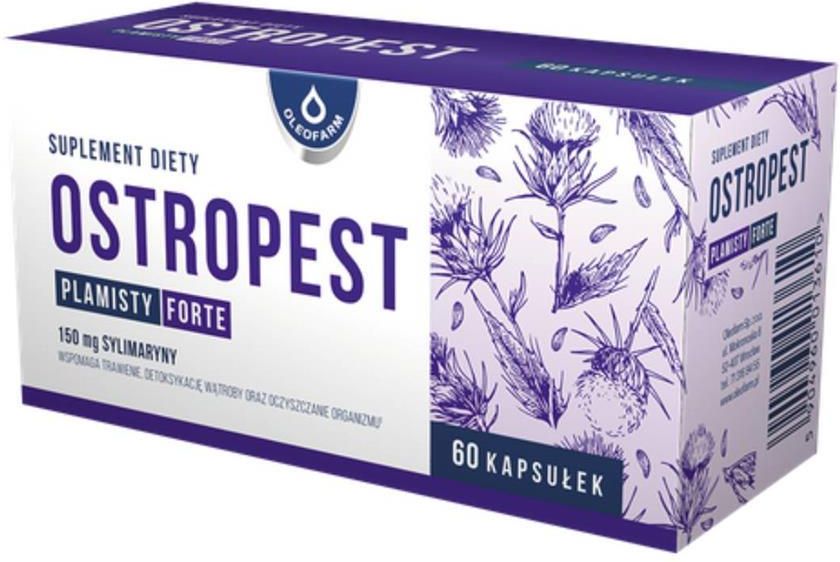 OSTROPEST PLAMISTY FORTE 60 KAPSUŁEK OLEOFARM OLEOFARM Ostropest plamisty forte Zawiera ekstrakt z nasion ostropestu plamistego standaryzowany na zawartość sylimaryny. Status suplement diety Suplement diety Ostropest plamisty forte to preparat zawierający ekstrakt z nasion ostropestu plamistego standaryzowany na zawartość sylimaryny. Ostropest plamisty wspomaga prawidłowe funkcjonowanie wątroby. Dodatkowo wspomaga funkcje detoksykacyjne wątroby, trawienie oraz oczyszczanie organizmu. Zastosowanie Preparat polecany jest osobom dorosłym w celu uzupełniania diety w ekstrakt z ostropestu plamistego, który wspomaga prawidłową pracę wątroby i trawienie. Zalecane spożycie Dorośli – 1 kapsułka dziennie przed posiłkiem. Nie należy przekraczać zalecanej porcji do spożycia w ciągu dnia. Suplementy diety nie mogą być stosowane jako substytu (zamiennik) zróżnicowanej diety. Utrzymanie prawidłowego stanu zdrowia wymaga zrównoważonego odżywiania i prowadzenia zdrowego trybu życia. Uwaga! Nie stosować u dzieci, kobiet w ciąży i karmiących piersią. Składniki: Ekstrakt z nasion ostropestu plamistego (Silybum marianum) standaryzowany na zawartość sylimaryny, inulina, substancja wypełniająca: celuloza, żelatyna (składnik otoczki), skrobia, substancja przeciwzbrylająca: sole magnezowe kwasów tłuszczowych, substancja przeciwzbrylająca: dwutlenek krzemu, barwnik: tlenki i wodorotlenki żelaza. Dzienna porcja (1 kapsułka) zawiera 214 mg ekstraktu z nasion ostropestu plamistego, w tym 150 mg sylimaryny. Przechowywanie: Przechowywać w temperaturze pokojowej, w suchym i ciemnym miejscu, w suchym i ciemnym miejscu. Suplementy diety powinny być przechowywane w sposób niedostępny dla małych dzieci. Zawartość: 60 kapsułek Masa netto 40g Ważne informacje dotyczące suplementu Nie należy przekraczać dziennej zalecanej porcji do spożycia. Zrównoważony sposób żywienia i prawidłowy tryb życia są ważne dla prawidłowego funkcjonowania organizmu. Suplement diety nie może być stosowany jako substytut (zamiennik) zróżnicowanej diety. Przechowywać w suchym i chłodnym miejscu, niedostępnym dla małych dzieci. Producent: Oleofarm Sp. z o.o., ul. Mokronoska 8, 52-407 Wrocław Suplement diety nie może być stosowany jako substytut (zamiennik) zróżnicowanej diety. Nie należy przekraczać dziennej zalecanej porcji do spożycia. Zrównoważony sposób żywienia i prawidłowy tryb życia są ważne dla prawidłowego funkcjonowania organizmu. Przechowywać w suchym i chłodnym miejscu, niedostępnym dla małych dzieci. Suplement diety nie jest LEKIEM nie leczy i nie zapobiega chorobom, natomiast służy uzupełnieniu diety w składniki odżywcze – w przypadku ich niedoboru.
