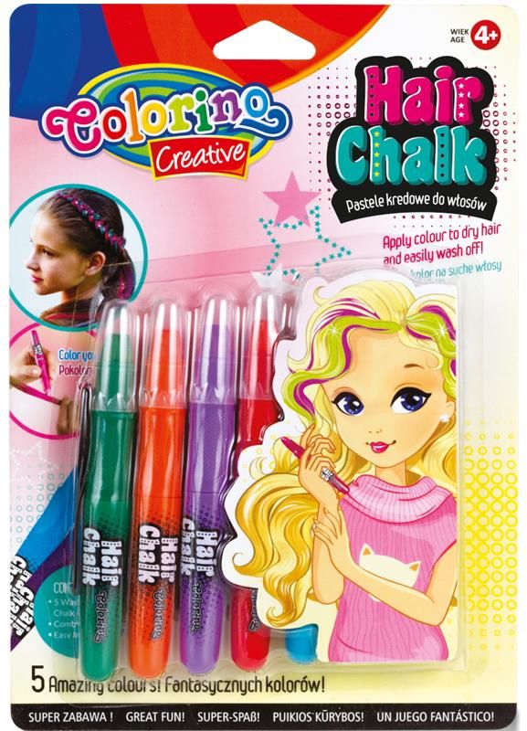 Wystarczy że pokolorujesz swoje włosy, a następnie użyjesz grzebienia do wygładzenia koloru, możesz nosić je w warkoczu, spięte lub rozpuszczone, a naniesiona barwa sama nie zejdzie. Zostań wraz z koleżankami oryginalnymi fryzjerkami i stwórzcie niepowtarzalne fryzury! Po skończonej zabawie kolor można zmyć szamponem. W zestawie 5 fantastycznych kolorów (po 6 g), grzebień oraz instrukcja. Produkt nietoksyczny. Zestaw zawiera: - 5 zmywalnych kredowych pasteli do włosów, - Grzebień, - Instrukcja. Wymiary opakowania: 17,5 x 25 x 2 cm