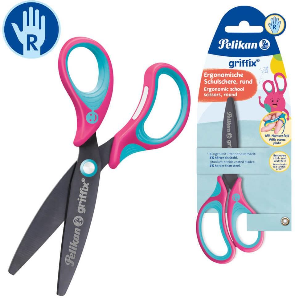 Nożyczki szkolne z serii Griffix: Posiadają ostrza tytanowe, trzy razy mocniejsze niż wykonane ze stali Ergonomiczny uchwyt z umieszczoną na nim buźką, która wskazuje prawidłowe ułożenie nożyczek w dłoni Zostały pokryte elastycznym tworzywem sztucznym, aby podnieść komfort wycinania Bardzo wygodne i lekkie i świetnie nadają się do prac dziecięcych Sprawdzona niemiecka jakość marki Pelikan Rozmiar uniwersalny: 14,5cm Dla osób praworęcznych Ostrze o długości: 5cm Kolor różowy