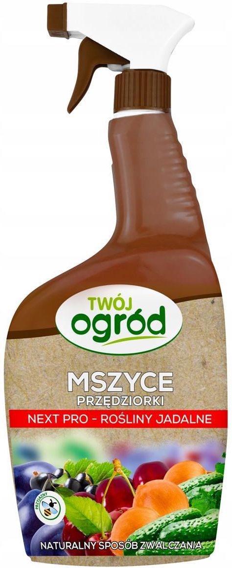 TWÓJ OGRÓD NEXT PRO - NATURALNY SPRAY NA MSZYCE PRZĘDZIORKI 1L - DO ROŚLIN JADALNYCH NEXT PRO - SPRAY NA MSZYCE PRZĘDZIORKI DO ROŚLIN JADALNYCH 1L Gotowy do użycia preparat stosowany w eliminacji szkodników tj. mszyc, przędziorków, larw miseczników; ograniczeniu liczebności miodówek, wielkopąkowca porzeczkowego, wciornastków, mączlika szklarniowego. Preparat działa na szkodniki interwencyjnie, w sposób fizyczny. Po oprysku preparat tworzy na powierzchni rośliny oraz ciałach szkodników powłokę, uniemożliwiając poruszanie się szkodników, co powoduje zaprzestanie ich żerowania i w rezultacie śmierć. Next pro jest mieszanką związków silikonowych. Preparat nie zawiera substancji aktywnych. NEXT PRO nie jest środkiem ochrony roślin w rozumieniu rozporządzenia WE Nr 1107/2009 gdy roślina została zaatakowana przez szkodnika oprysk szkodnika unieruchomienie owada i jego śmierć skuteczna eliminacja szkodników = zdrowa roślina Next Pro należy stosować w momencie pojawienia się pierwszych kolonii szkodników. Zabieg można powtórzyć w razie potrzeby po 5-7 dniach lub później. Należy bardzo dokładnie pokryć chronione rośliny cieczą roboczą, w szczególności miejsca żerowania szkodników. W przypadku zwalczania przędziorków należy pokryć górną i dolną stronę liści. Opakowanie: 1000ml
